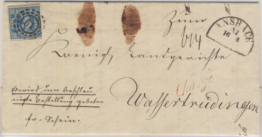 Wassertrüdingen - mit Inhalt - Marke rechts knapp ansonsten vollrandig - hds. Vermerk "Es wird um beschleunigte Bestellung gebeten"