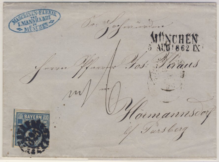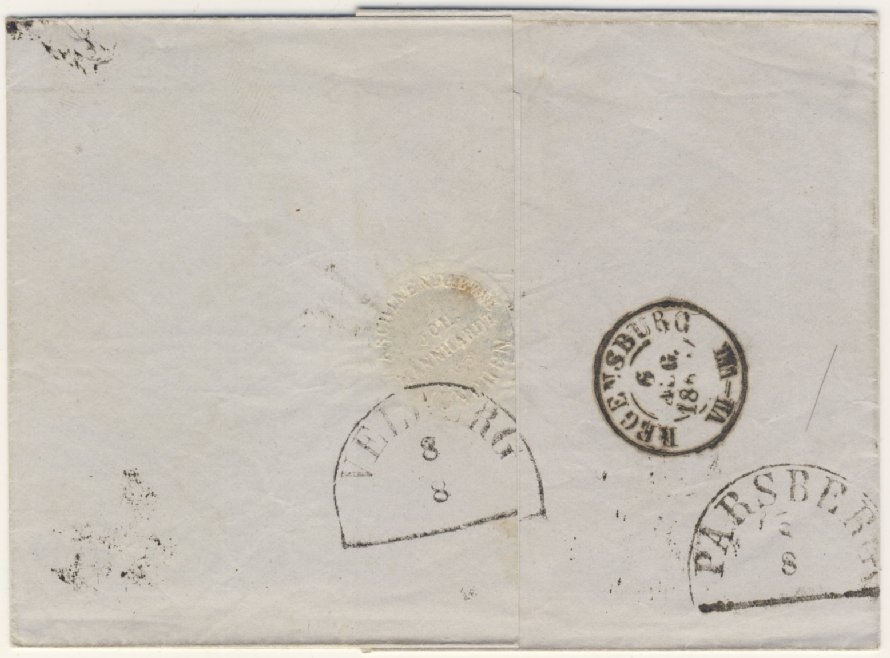 b. Parsberg - ohne Inhalt - rs. Durchgangsstpl. Regesnburg + Velburg - Marke voll- bis überrandig - 6 Kr. Nachporto