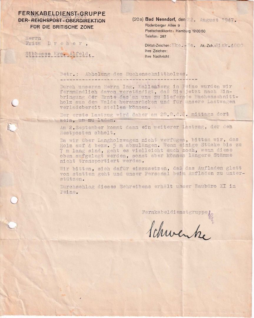 Schreiben der Fernkabel-Dienstgruppe f.d. Britische Zone bzgl. Abholung von Buchenschnittholz - übliche Aktenlochung
