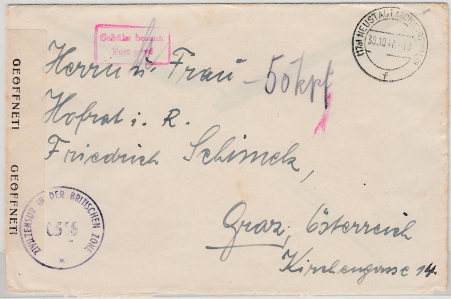 All.Bes. - Neustadt (Schwarzwald) 1947, Gebühr bezahlt, Ra2 Zensurbrief n.
