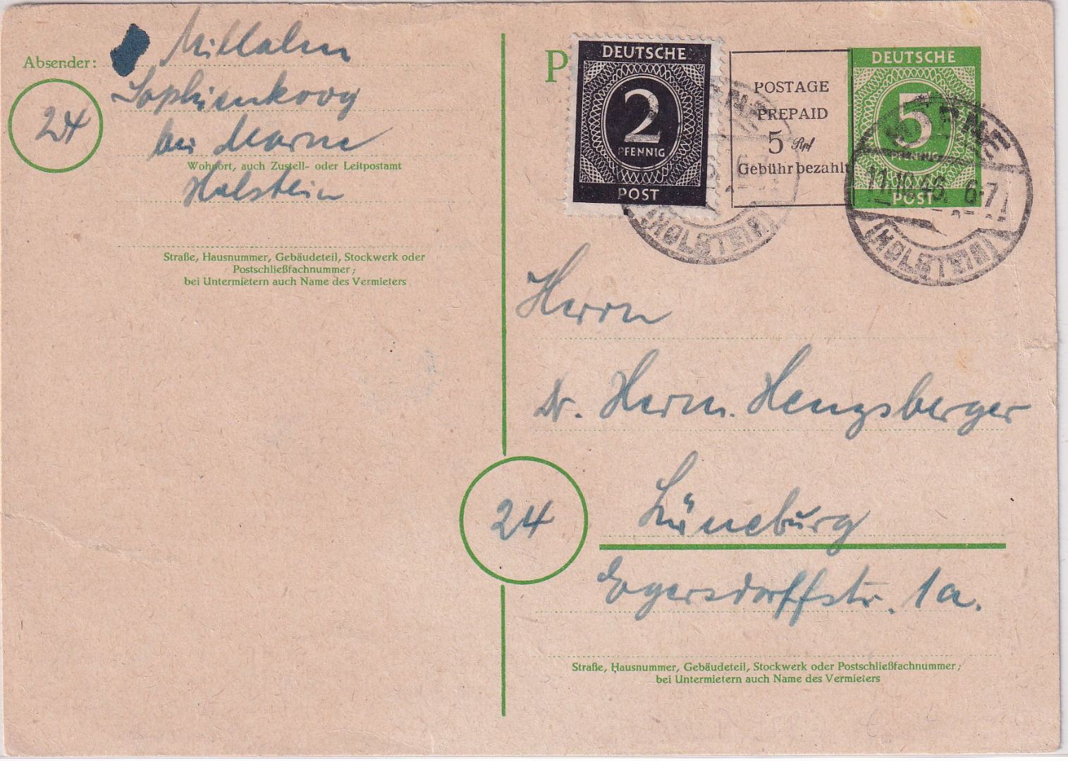 All.Bes./RPD Hamburg - 5+5 Pfg. Aufbrauchsganzsache+Zusatz Marne - Lüneburg 1946