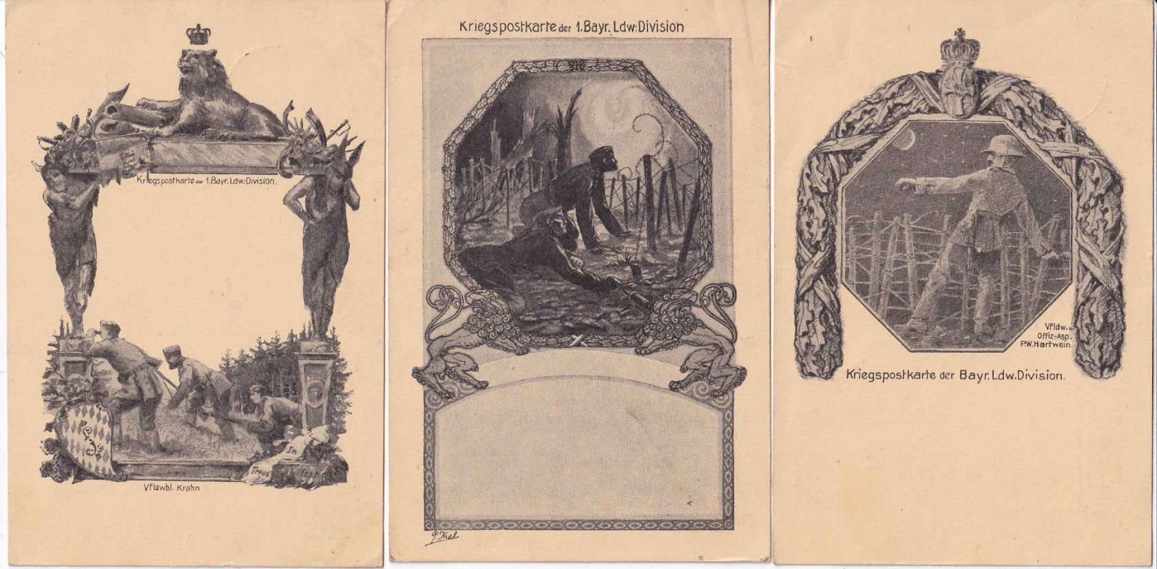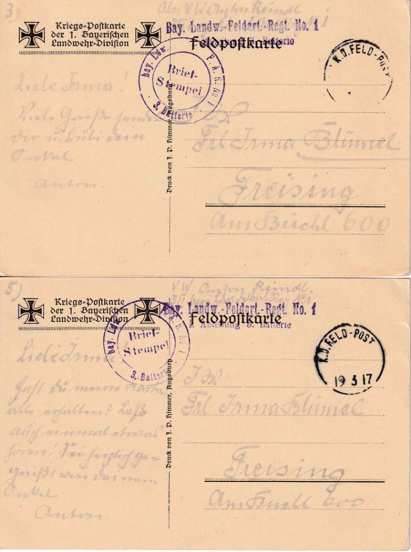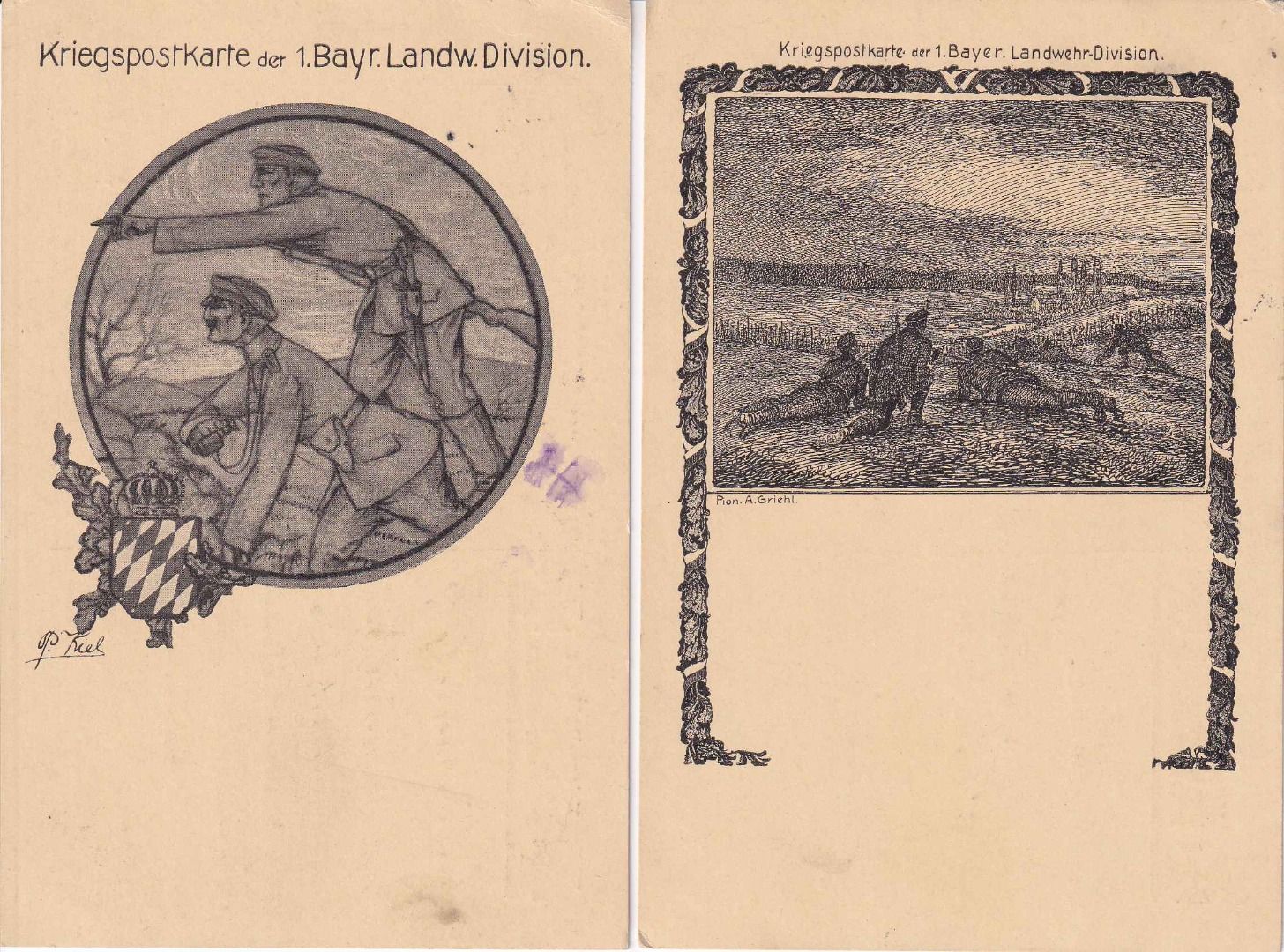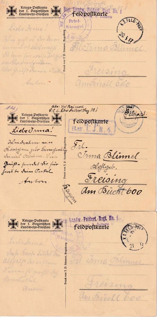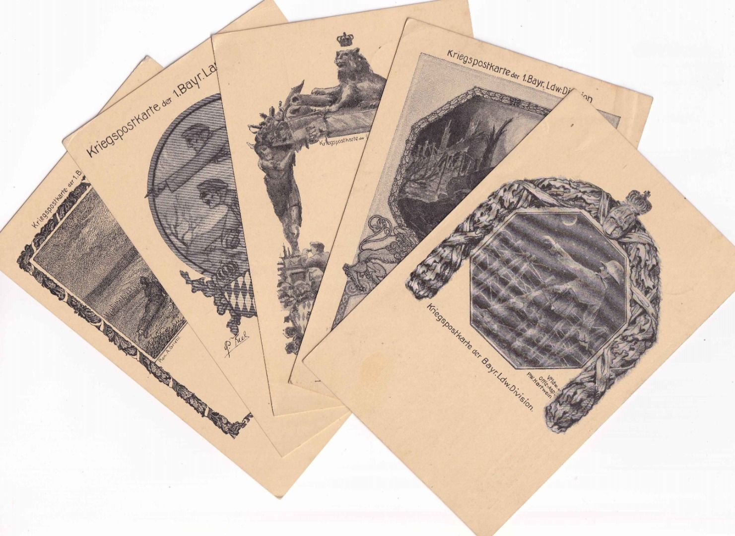 alle Karten adr. nach Freising - 5 versch. Motive (nach Zeichnungen von Soldaten)