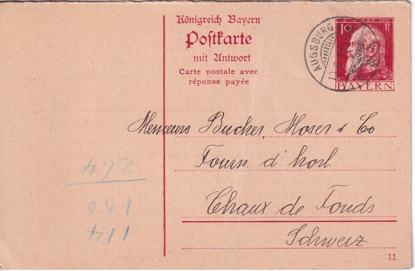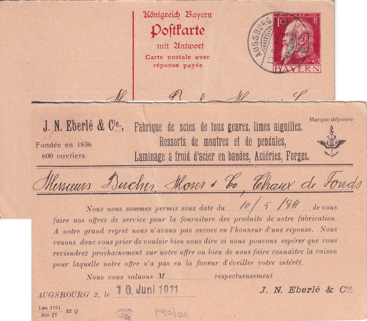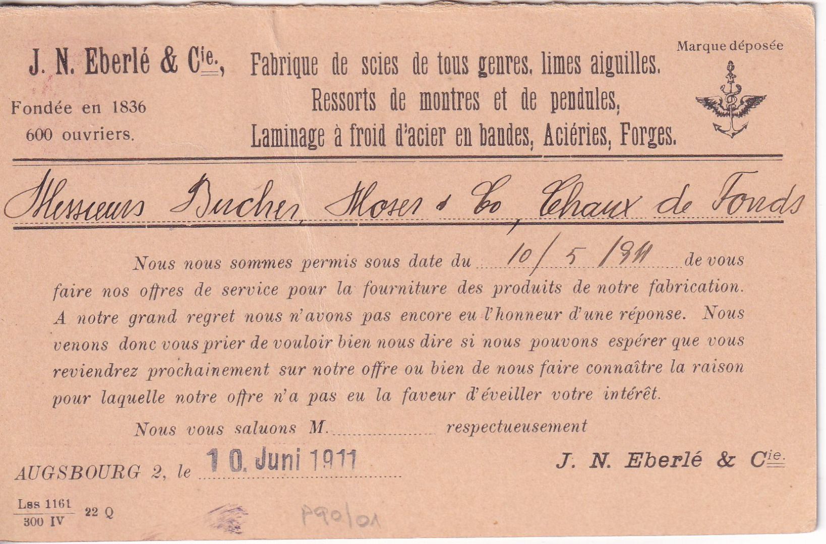 gelaufen n. Chaux de Fonds 1911 - rs. Zudruck der Firma Eberle & Cie. (Sägebänder, Bandstahl) - Karte mittig zarte Knickspur