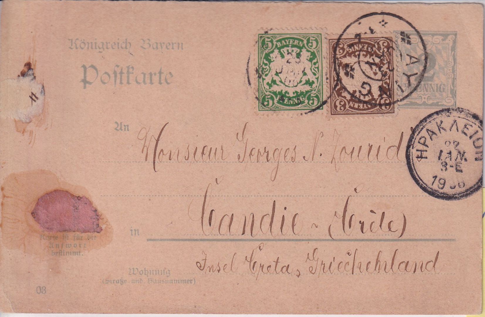 Bayern - 2 Pfg. Rauten Ganzsache+Zusatz n. GRIECHENLAND (Kreta !) Aying 1906