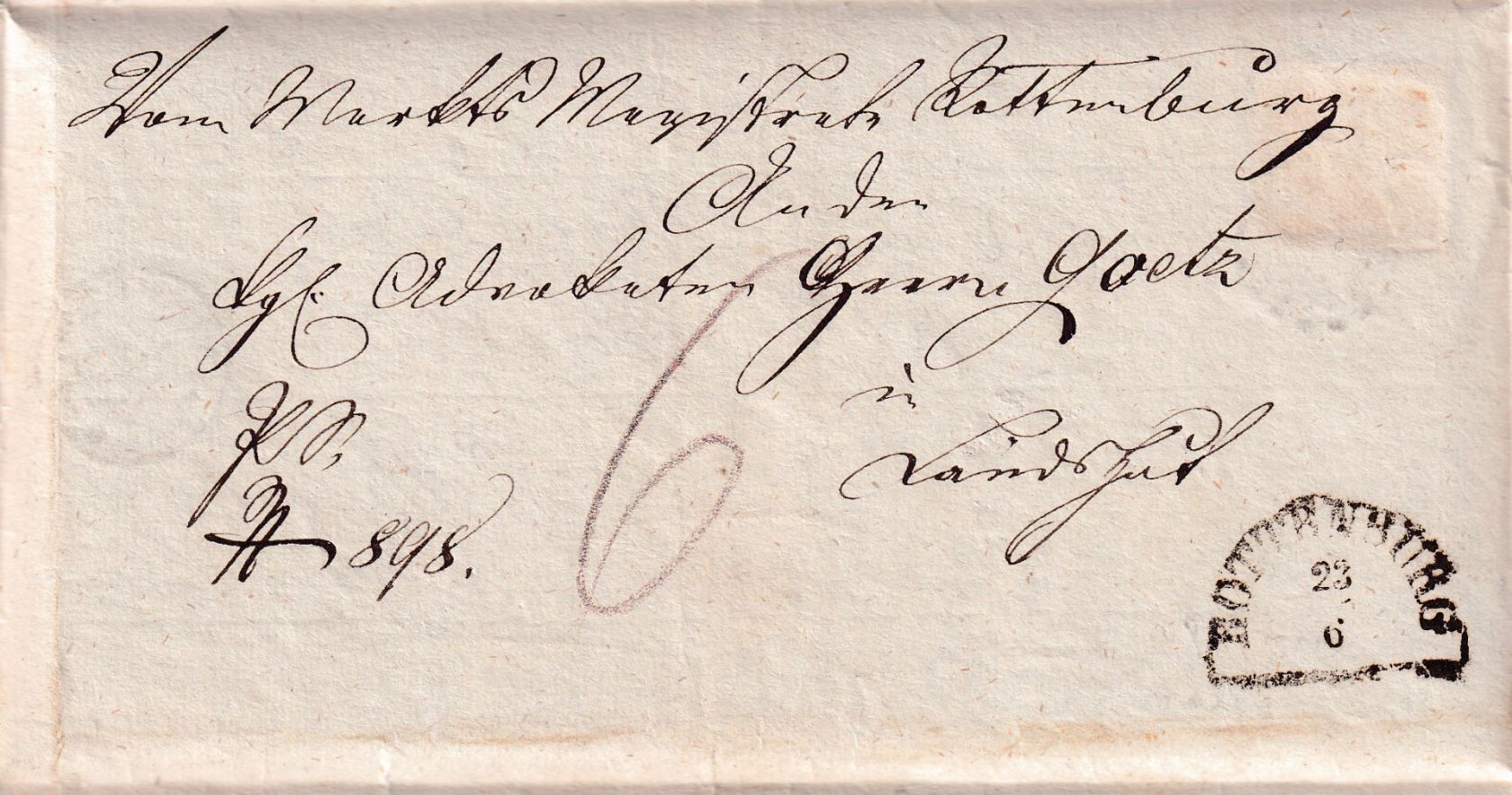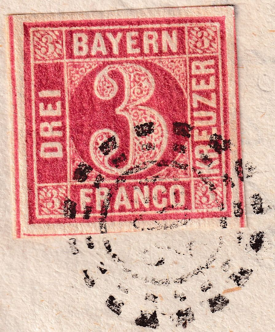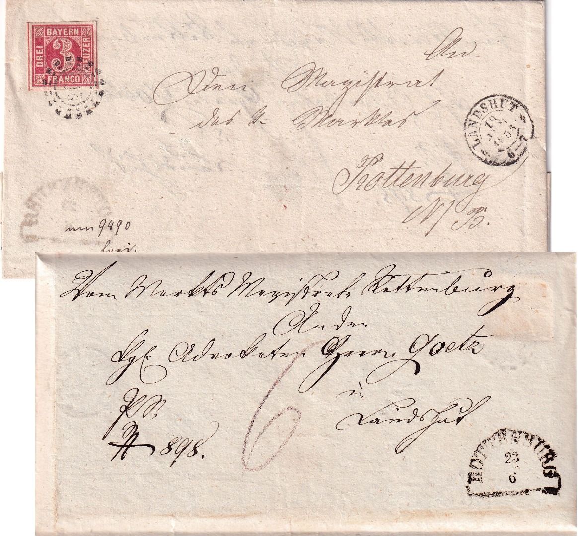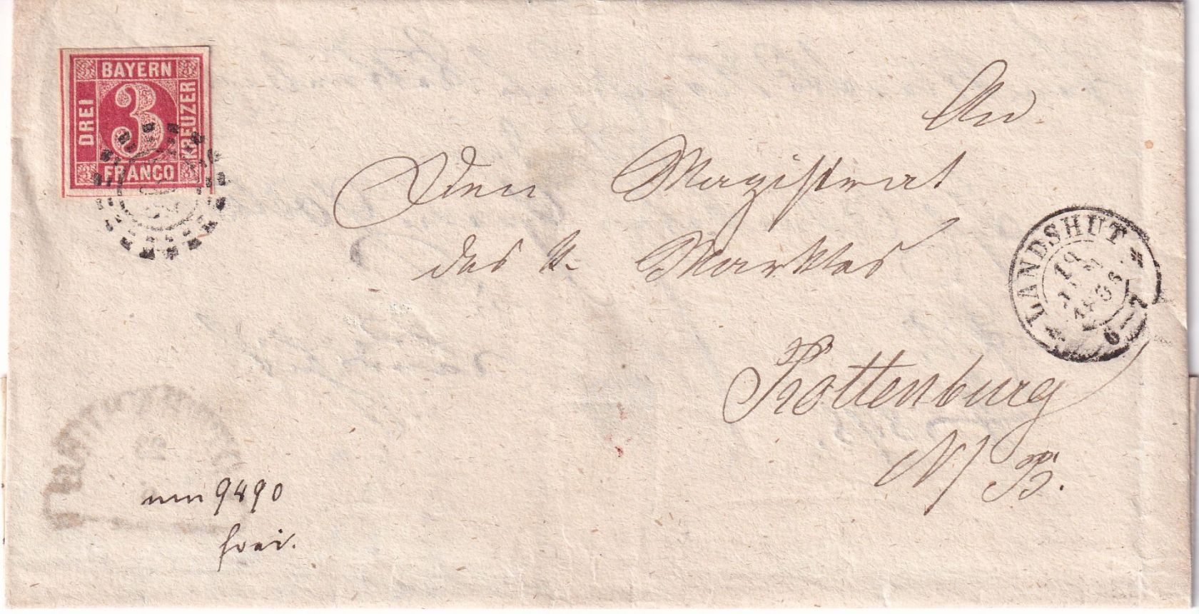 gelaufen n. Rottenburg - innen: 6 Kr. Portobrief vom 23/6 (1866) n. Landshut - Marke allseits breitrandig (4 SL !) - ohne Inhalt