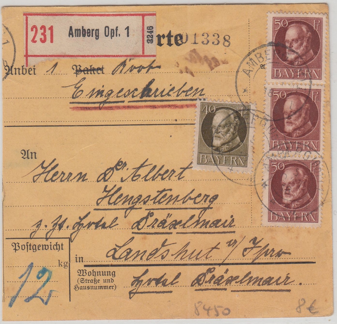 Bayern - 3x50+40 Pfg. Ludwig Einschreibepaketkarte Amberg - Landshut 1918