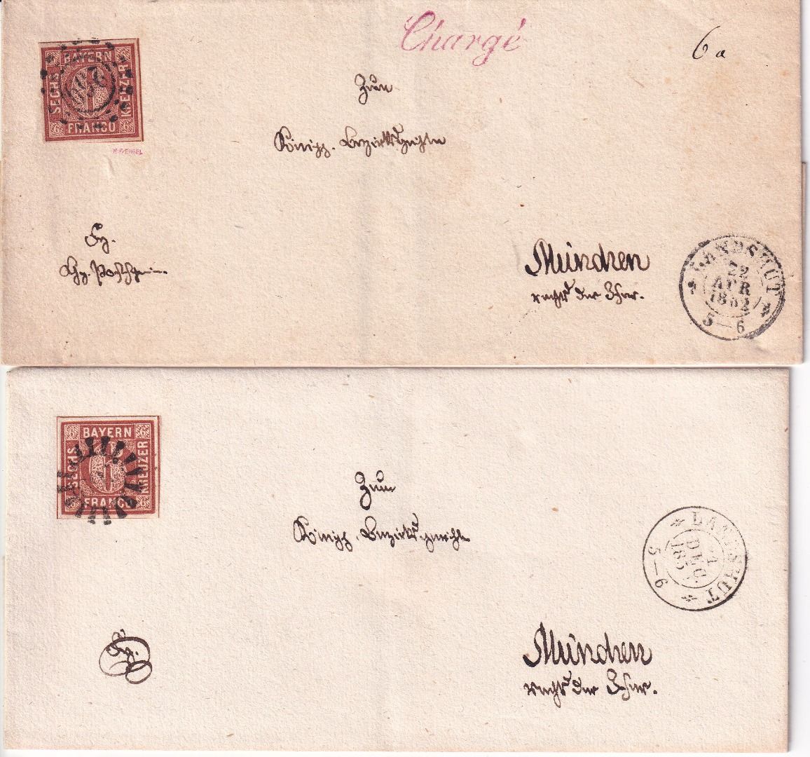 1x roter Schreib-L1 "Charge" (1862) - beide briefe ohne Inhalt n. München - beide Marken breit- bis überrandig - tolles Päärchen !