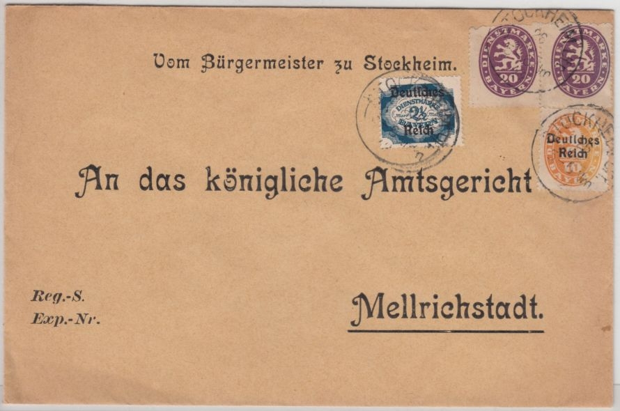 Mellrichstadt - 1x20 Pfg. + 1x10 Pfg. bereits defekt verwendet - sehr späte Verwendung für Bayern-Dienst - ohne Inhalt