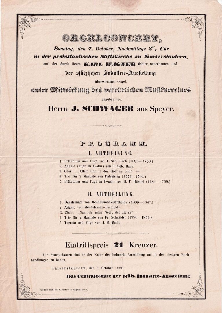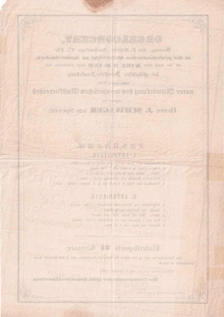 anl. der pfälz. Industrie-Ausstellung in der protestantischen Stiftskirche zu Kaiserslautern, gegen v. J. Schwager aus Speyer - üblich gefaltet und überdurchschnittliche Erhaltung (nur rechts oben kl. Eckschaden, rs. kl. Risschen mit Archivband verschlossen)