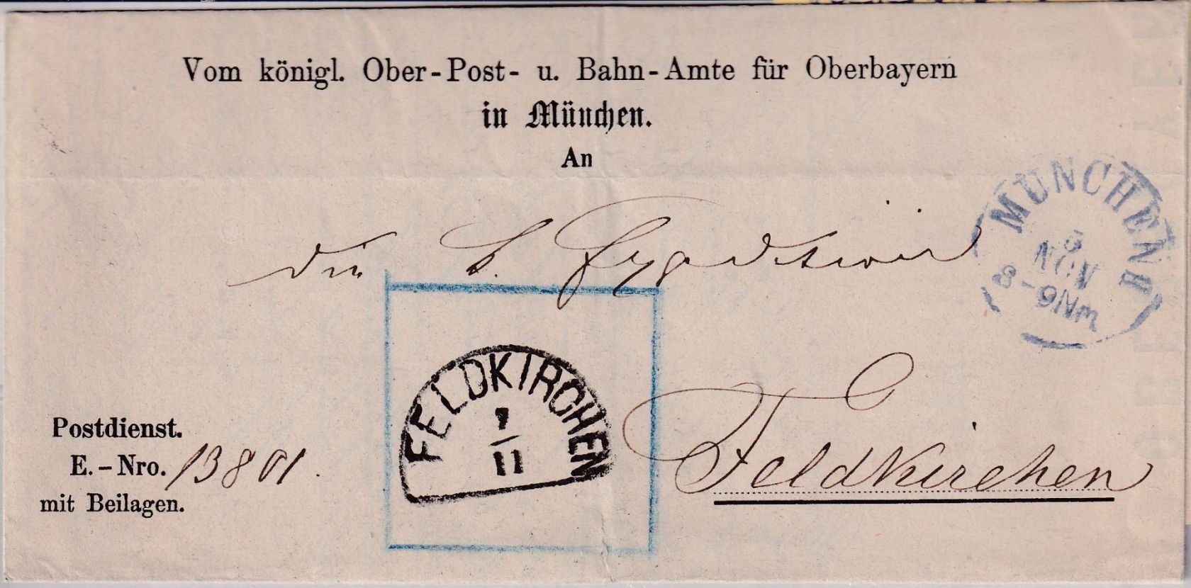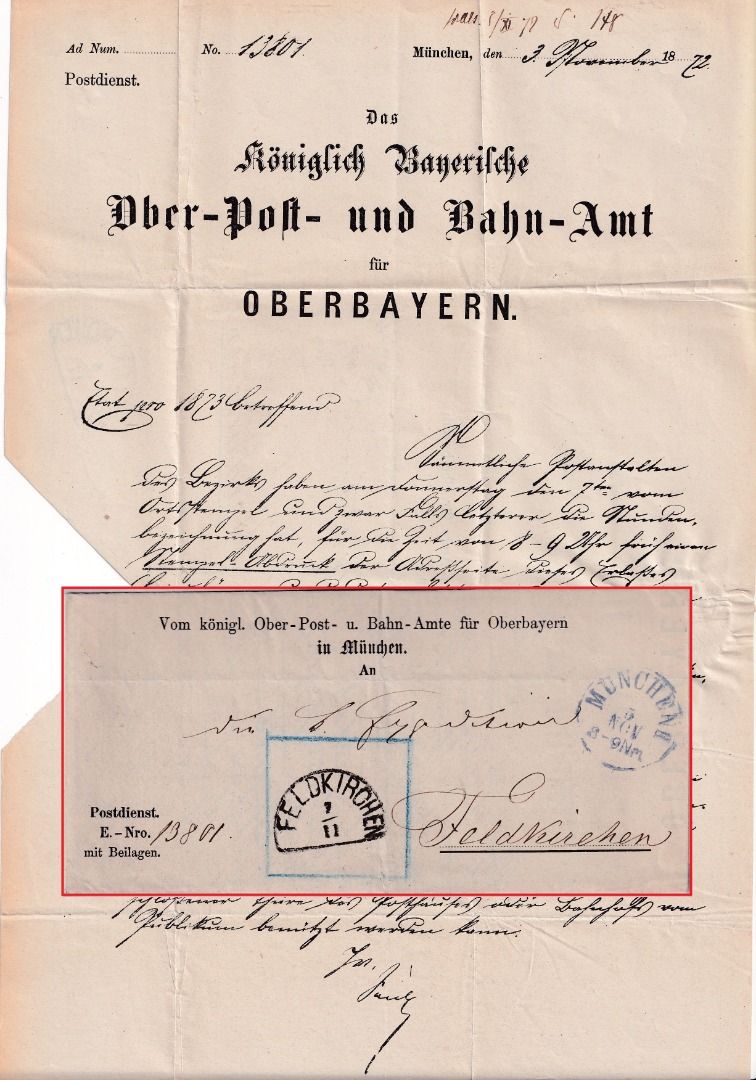 Schreiben des "Königlich bayerischen Ober-Post- und Bahn-Amt für Oberbayern" an die Postexpedition Feldkirchen mit der Anweisung einen Abschlag des Tagesstempels (Abnutzungsüberprüfung) - der Stempel wurde vds. abgeschlagen und der Brief nach München retourniert - sehr seltener Innendienstbeleg !