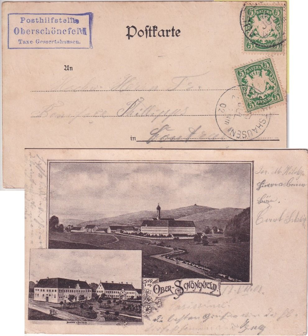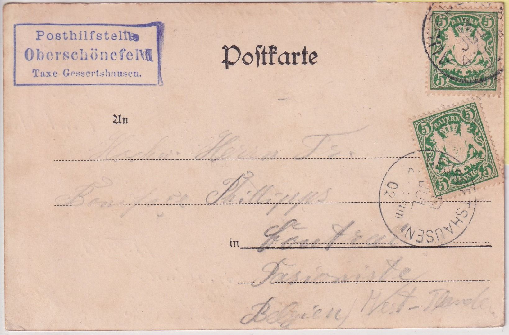 Bayern Oberschönefeld T. Gessertshausen Posthilfstelle Ra3 Karte n. BELGIEN 1902