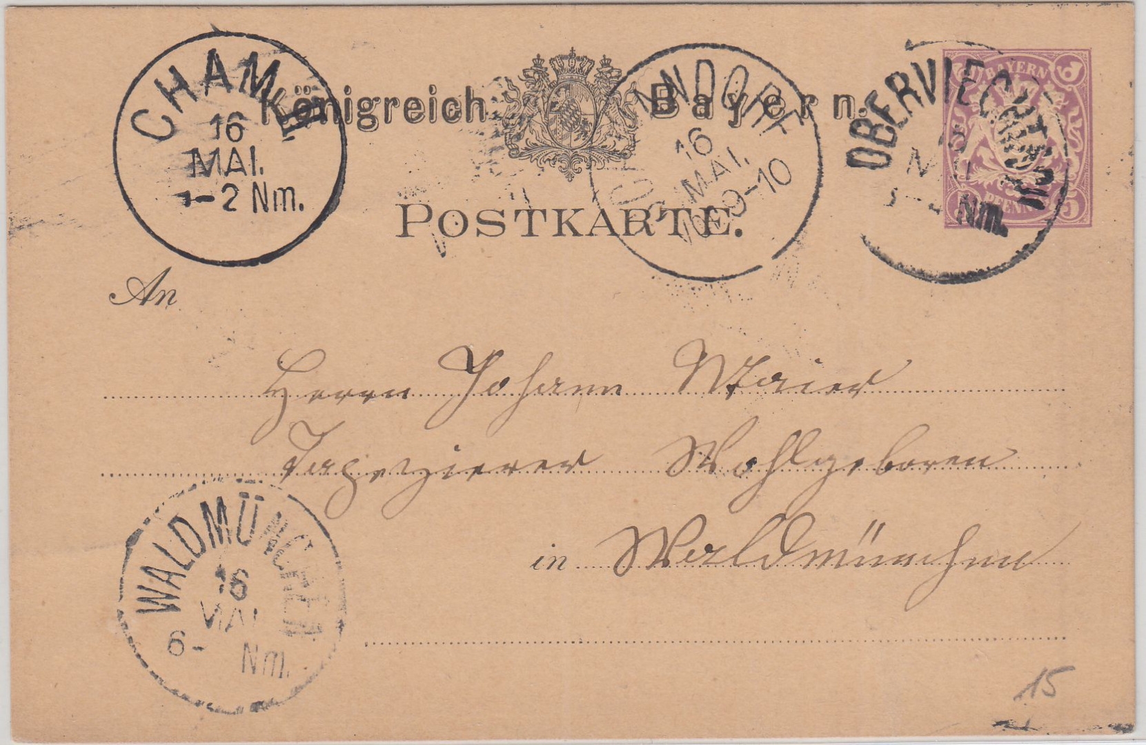 Durchgangsstempel Cham und Schwandorf u. Ank.stpl. Waldmünchen - schöne Postweg-Dokumentation !