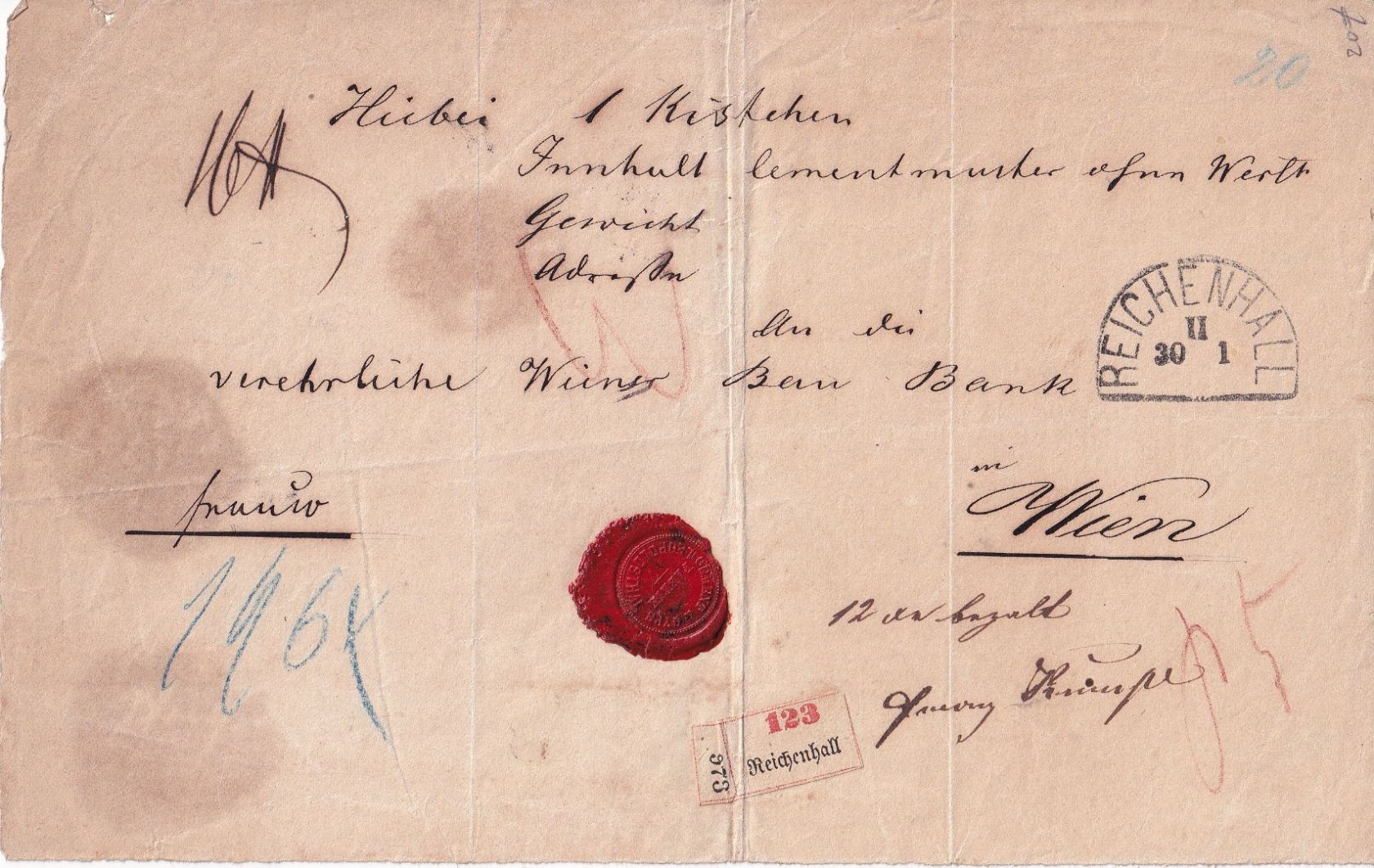 adr. n. Wien - "Inhalt Cementmuster ohne Wert" - vds. Wachssiegel "Cement- & Gyps-Fabrik Leopoldsthal"