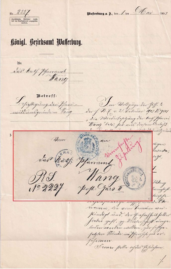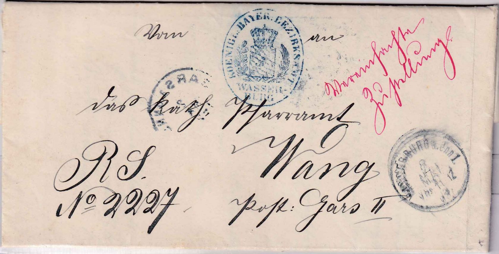gelaufen n. Wang Post Gars - vds. hds. Vermerk "vereinfachte Zustellung" (rs. Zustellvermerk des Postboten) - mit Inhalt - Stichwort: Zustellurkunde