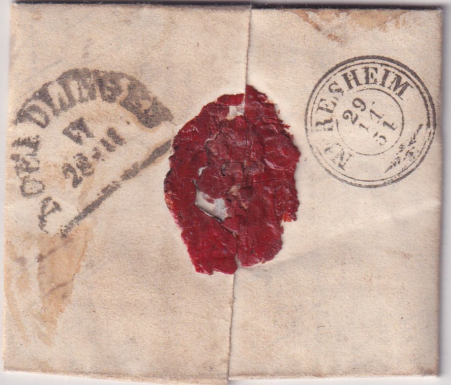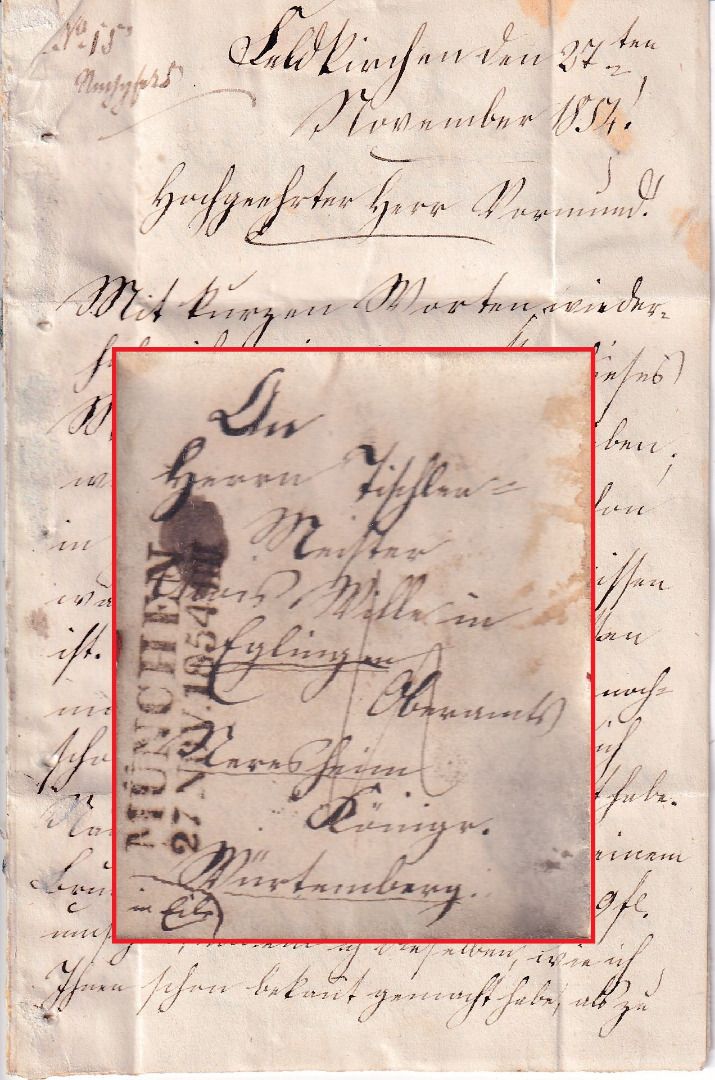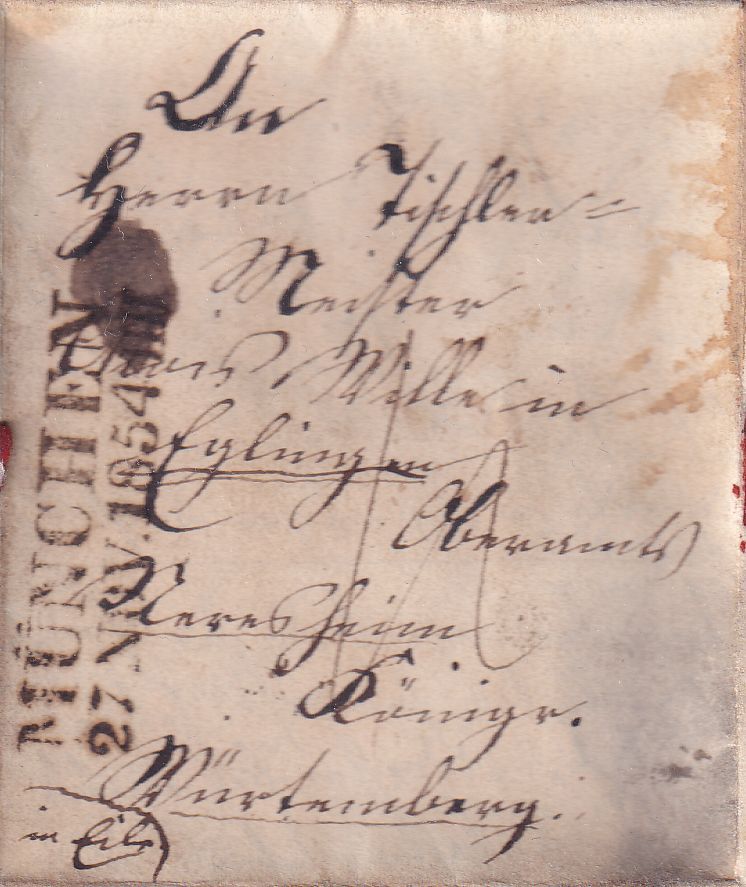 gelaufen n. Eglingen b. Neeresheim - vds. (irrtümlich) 12 Kreuzer Taxierung (bis 1 Loth, 1. Entfernungstufe = 9 Kreuzer Porto) - mit Inhalt - rs. Durchgangsstempel Nördlingen u. Neresheim - vds. leicht fleckig