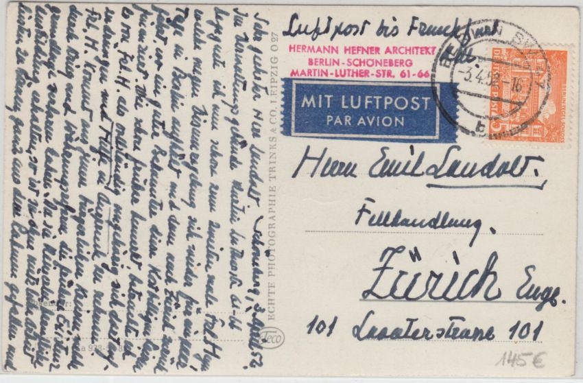 n. Zürich - Luftpostgebühr wurde nur bis Frankfurt bezahlt - ab da Landweg -selten !!