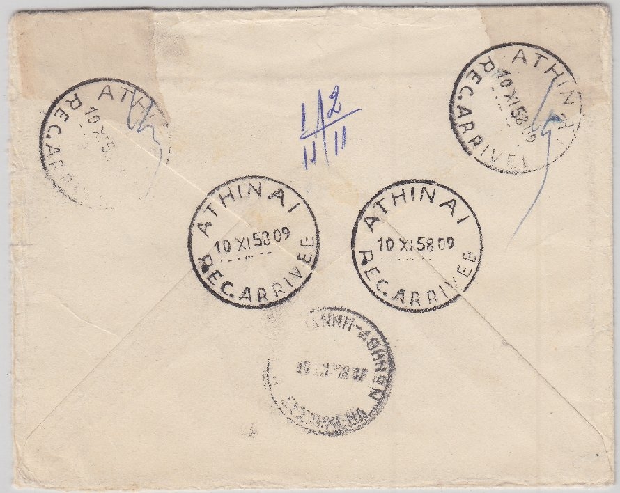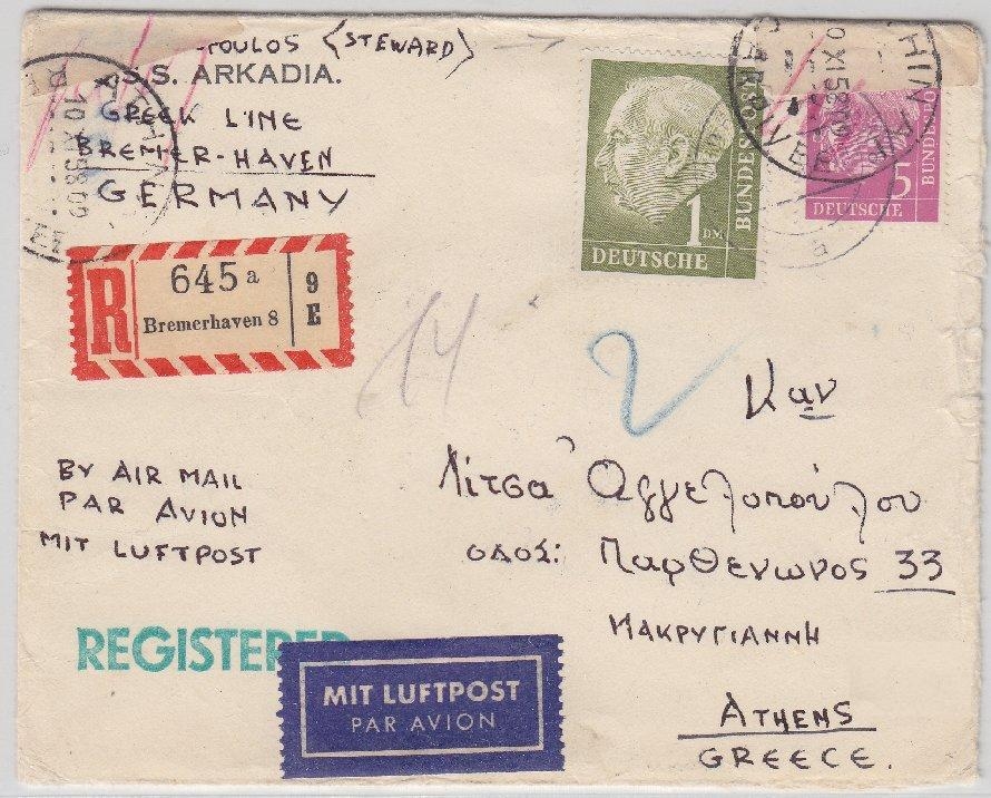 n. Athen 1958 - in Athen offenbar amtlich verschlossen (siehe Verschlusszettel li. u. re. oben + Poststempel) - Abs. Besatzungsmitglied d. QSS Arkadia Greek Line - portorichtig: Brief 40 + Einschreiben 50 + 15 Luftpostzuschlag