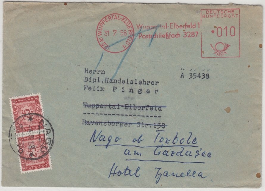 1958 - 2x25 L. ital. Portomarken - Umschlag rs. kl. Öffnungsmgl. - ohne Inhalt