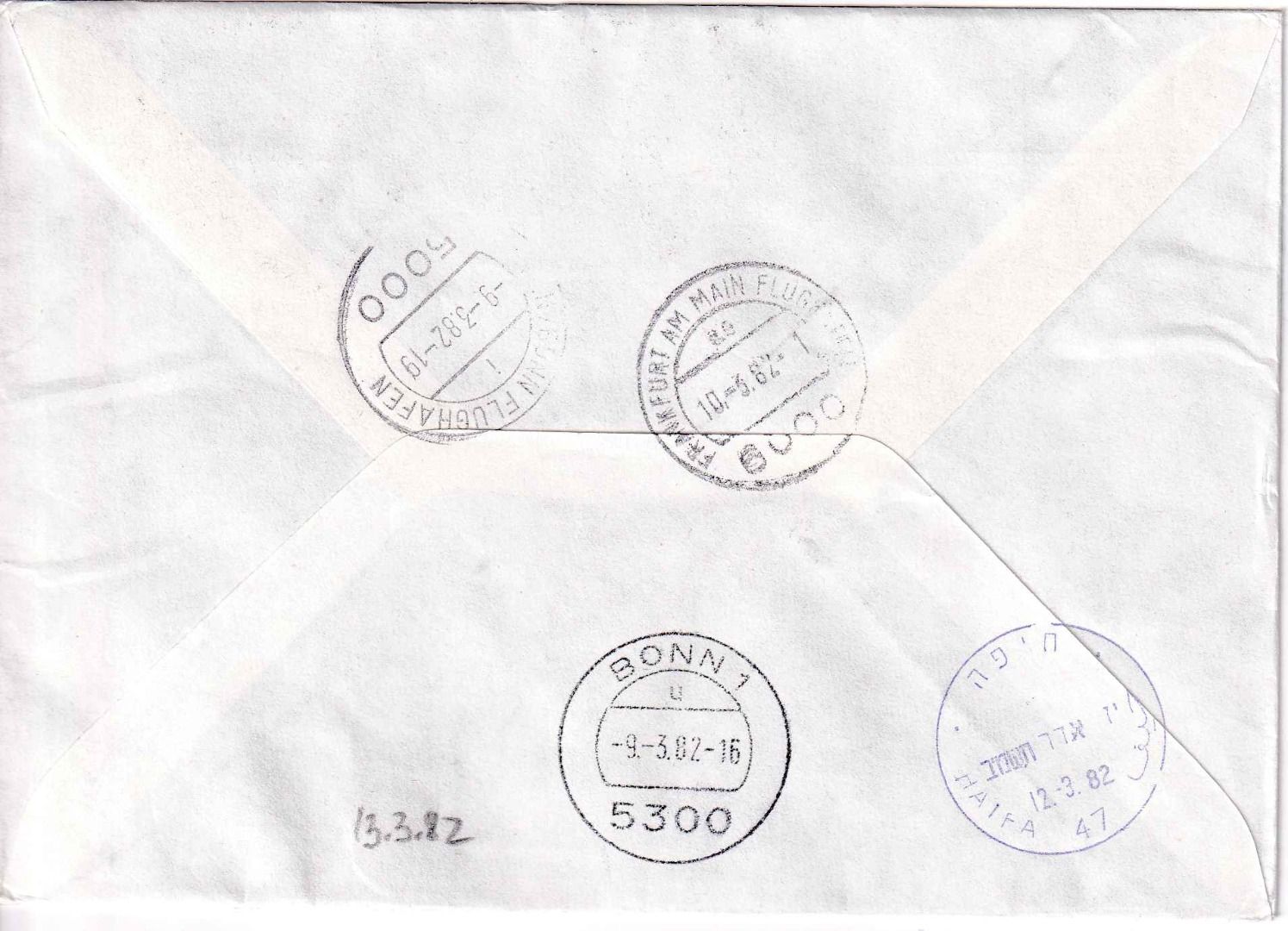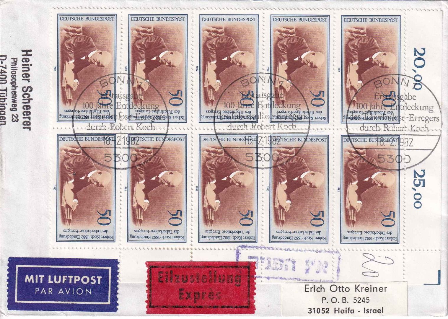 gelaufen v. Bonn n. Haifa - portorichtig: 150 Pfg. Brief bis 50g + 250 Pfg. Eilgebühr + 5x20 Pfg. Lupo je 5g = 500 Pfg. - rs. Durchgangs- und Ank.stempel - ohne Inhalt - Stichwort: Tuberkulose, Medizin