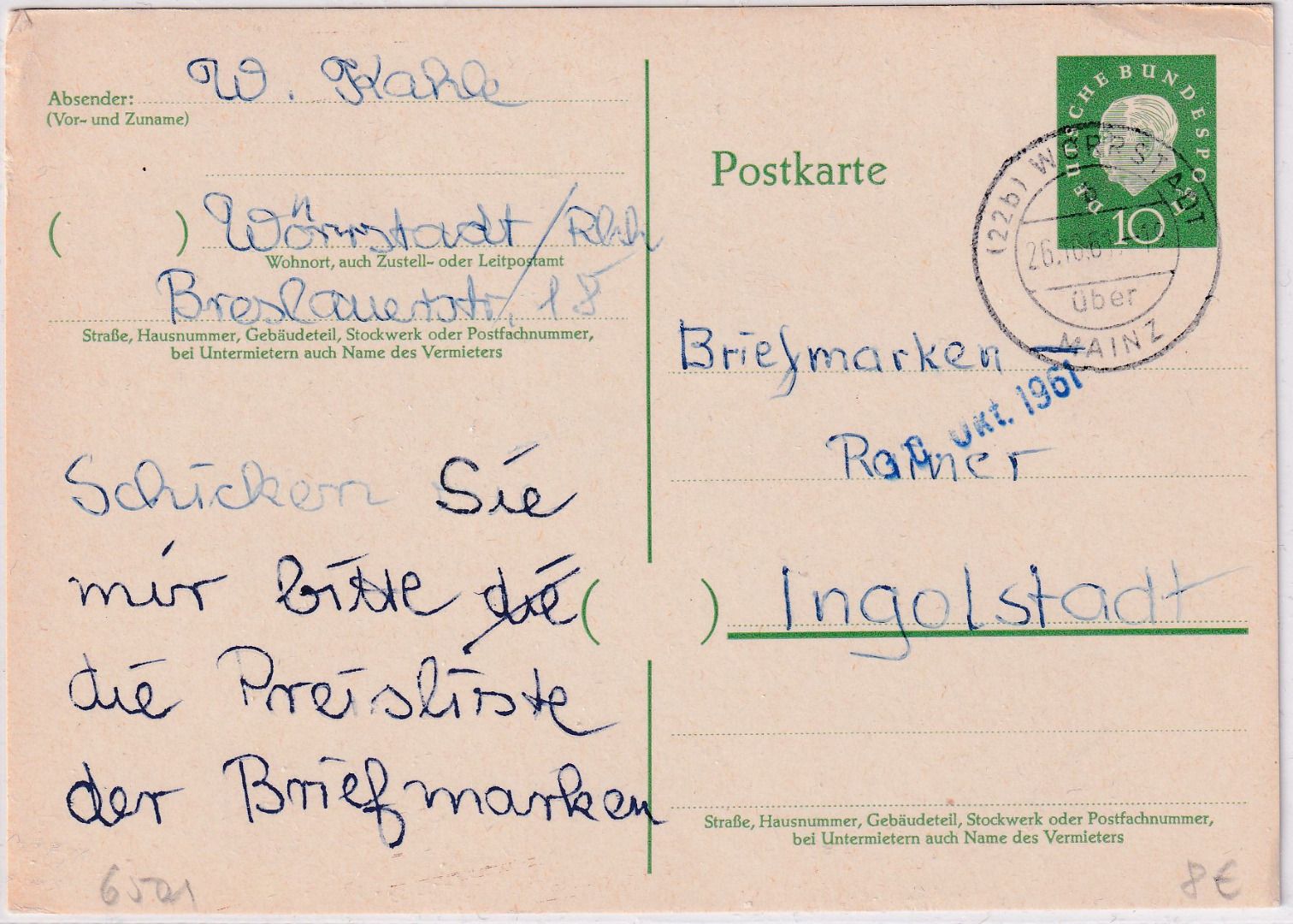 BRD - (22b) Wörrstadt ü. Mainz Poststelle I Tagesstempel Ganzsache 1961