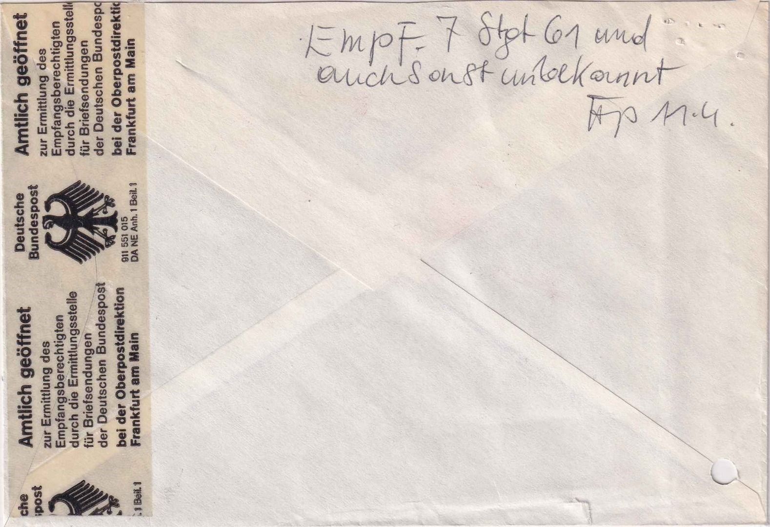 rs. Verschlussstreifen der Ermittlungsstelle der OPD Frankfurt a/M - Kuvert links unten Aktenlochung - ohne Inhalt -