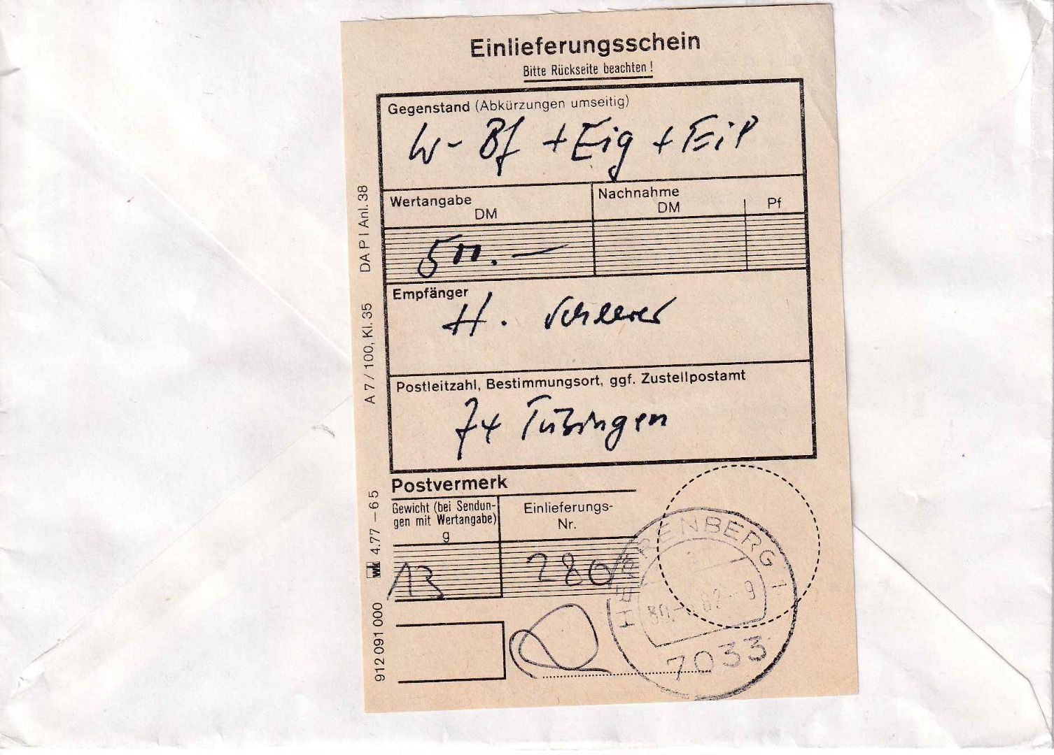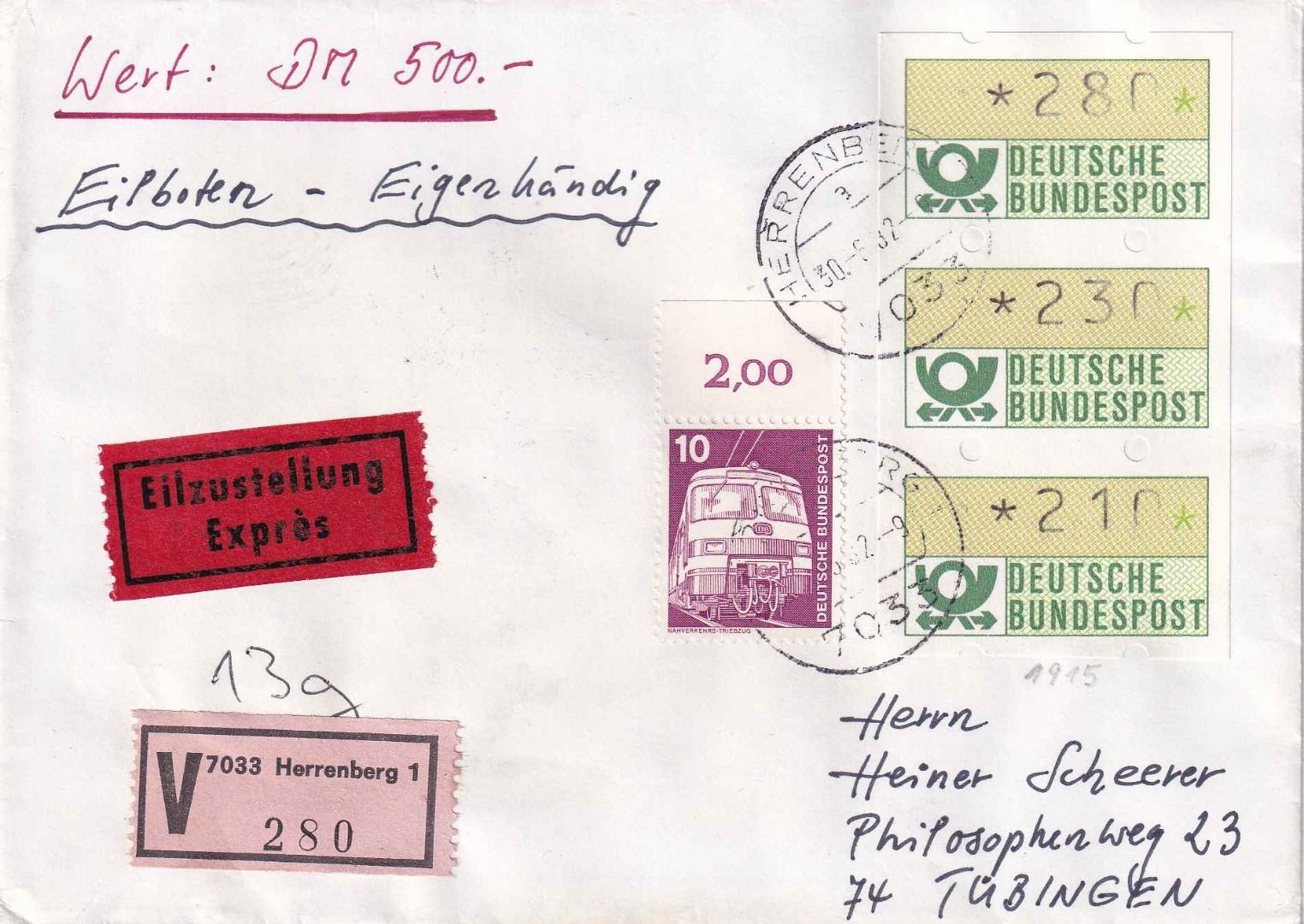 drei versch. Wertstufen im 3er-Streifen zusammenhängend - gelaufen v. Herrenberg n. Tübingen - ohne Inhalt - Tarif: Brief 60 + Eil 250 + Wert 300 + Eigenh. 120 - mit Einlieferungsschein