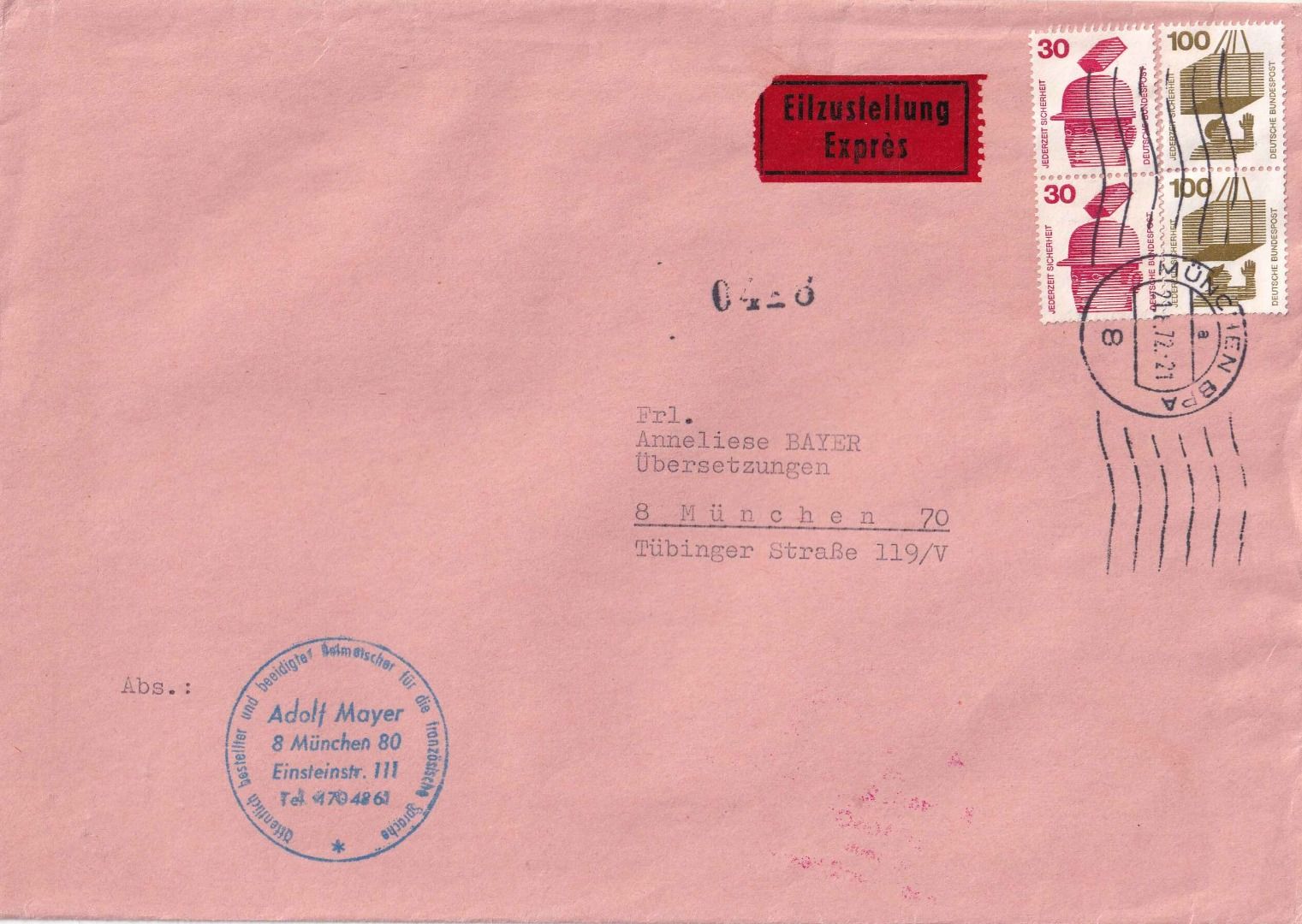 2. Gewichtsstufe bis 50g = 60 Pfg. + 200 Pfg. Eilgebühr - ohne Inhalt