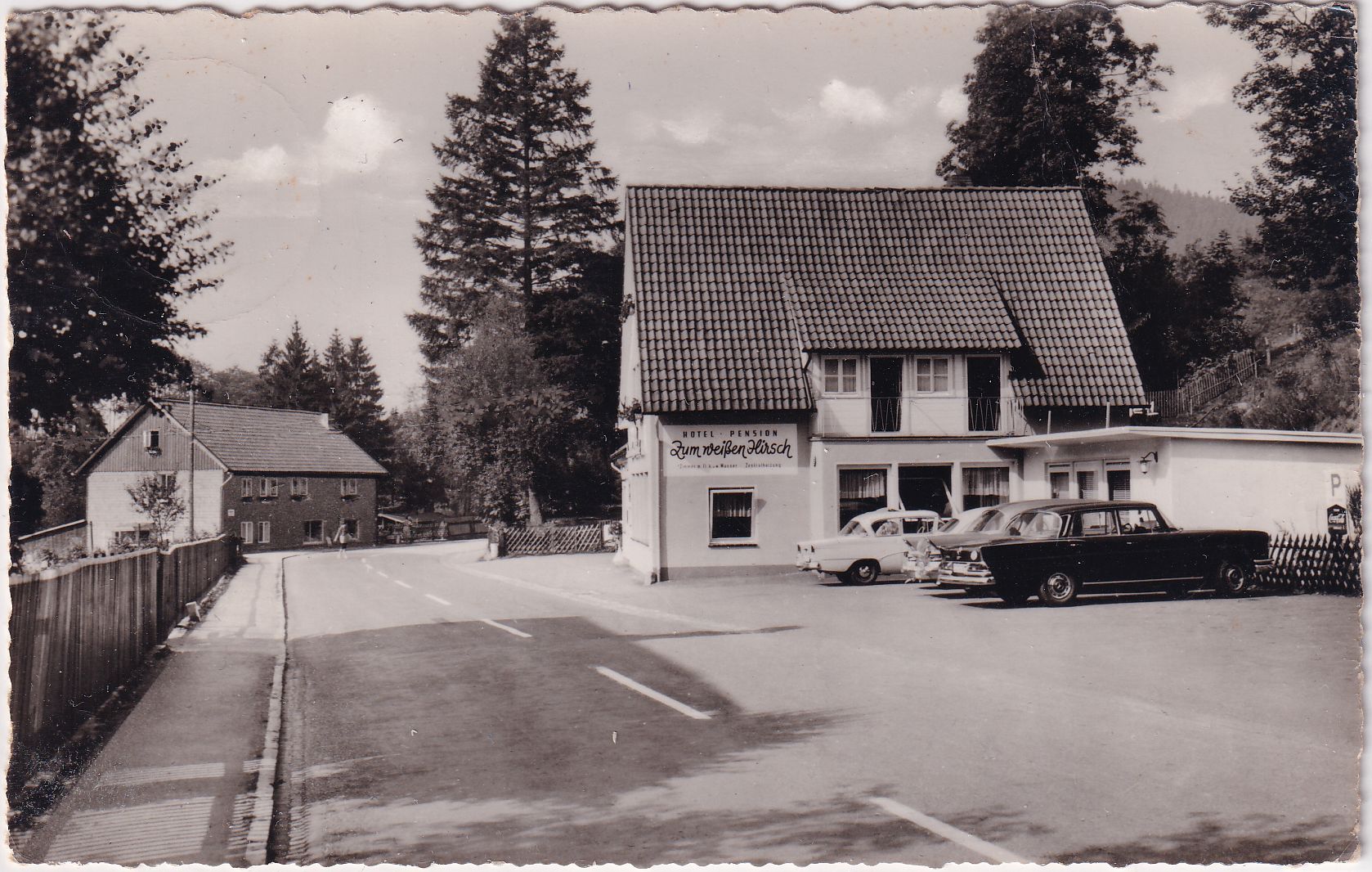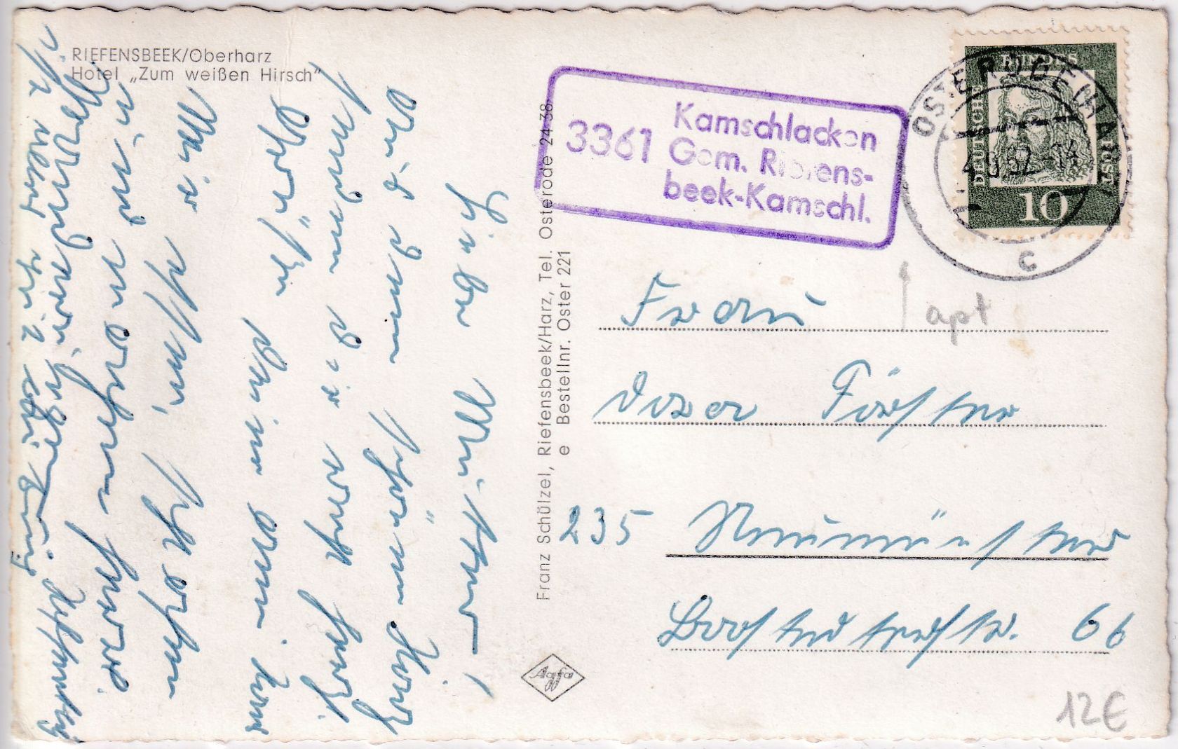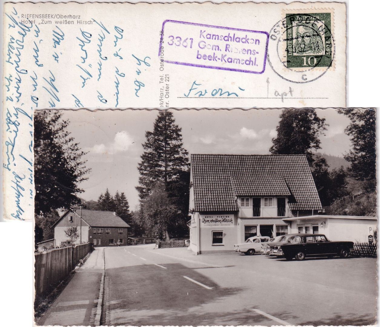 gelaufen n. Neumünster - Marke mit apt. Tagesstpl. Osterode (Harz) entwertet - PLZ-Umstellung - sw-AK Hotel/Pension Zum weißen Hirsch
