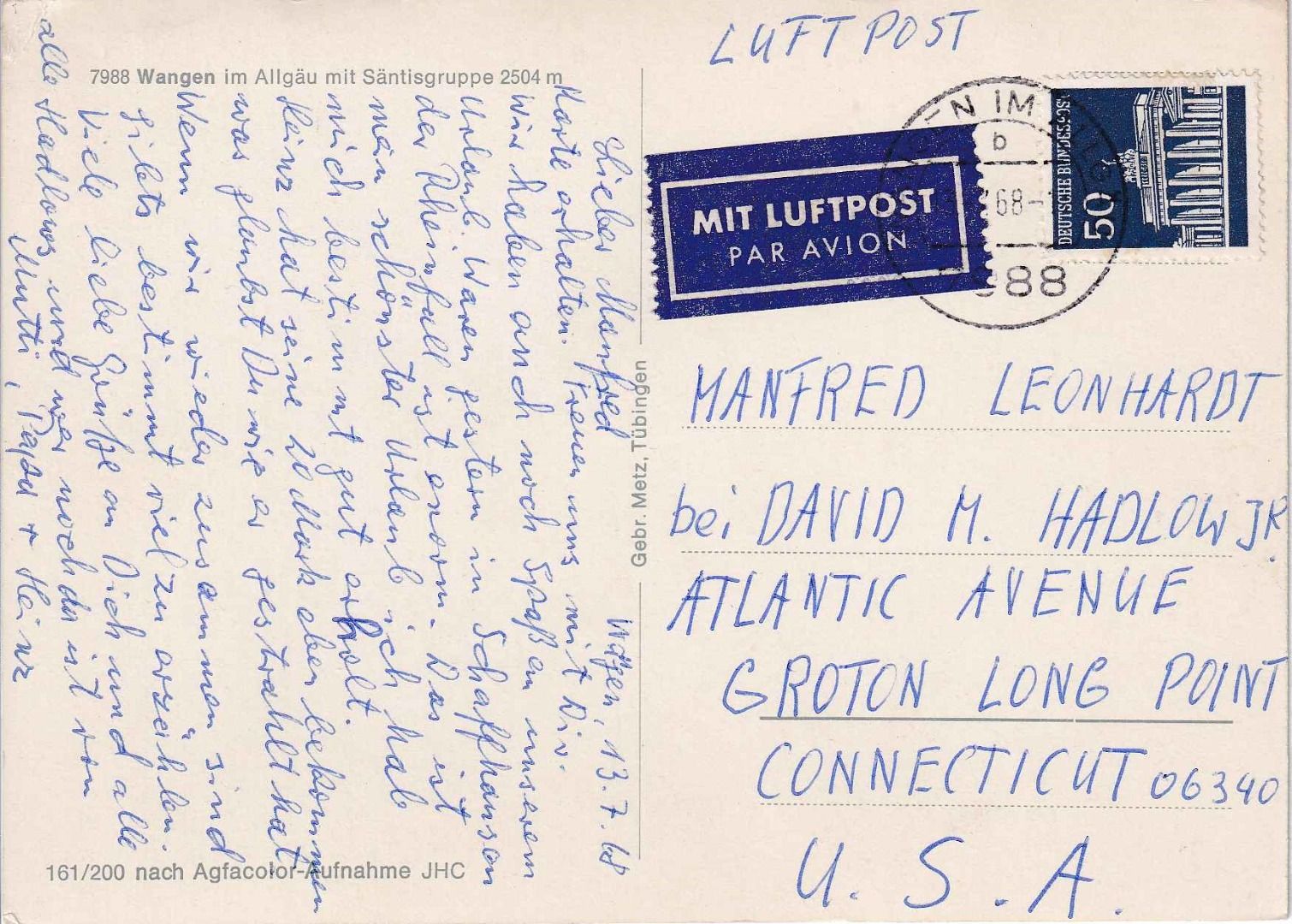 BRD - 50 Pfg. Brandenburger Tor Luftpostkarte n. USA Wangen - Groton 1968