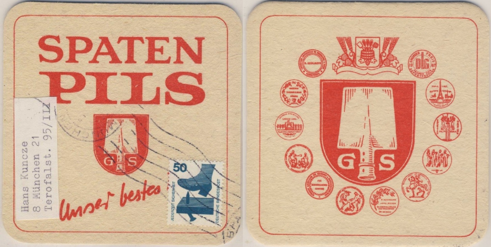 BRD - 50 Pfg. Unfallverhütung Bierdeckel (Spaten Pils) als "Ortsbrief"