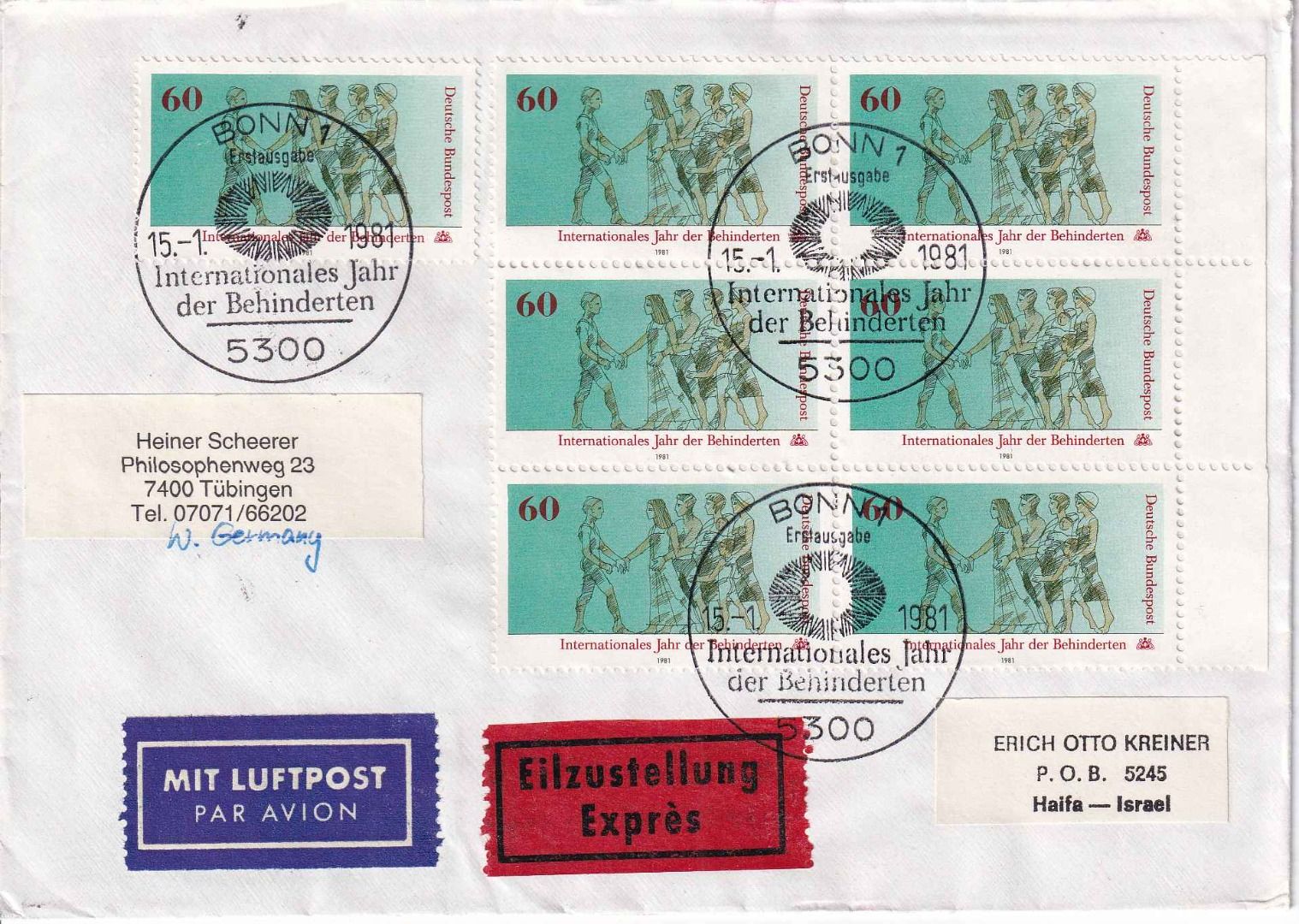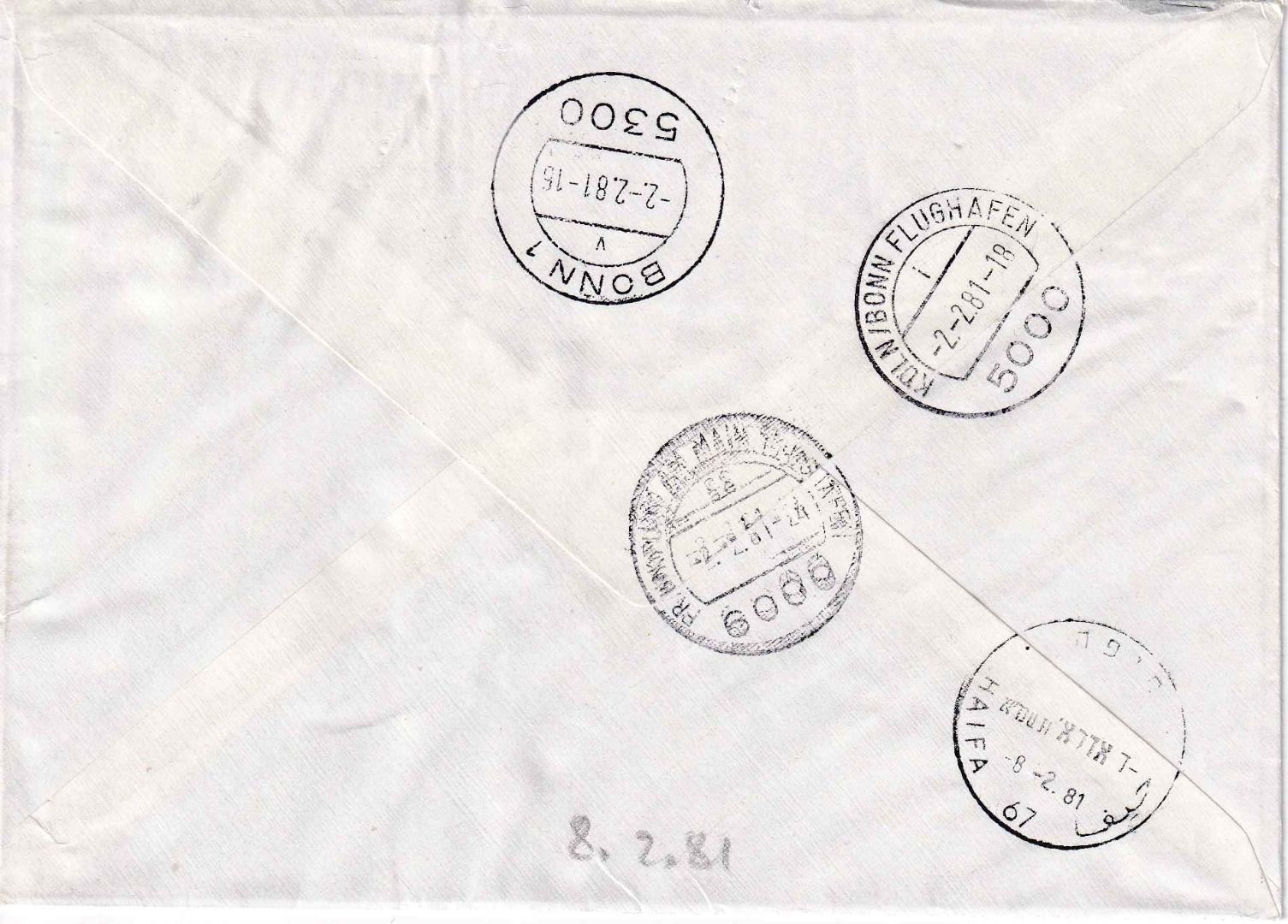 gelaufen v. ESST Bonn n. Haifa - portorichtig: 90 Pfg. Brief bis 20g + 250 Pfg. Eilgebühr + 4x20 Pfg. Lupo je 5g = 420 Pfg. - rs. Durchgangs- und Ank.stempel - ohne Inhalt