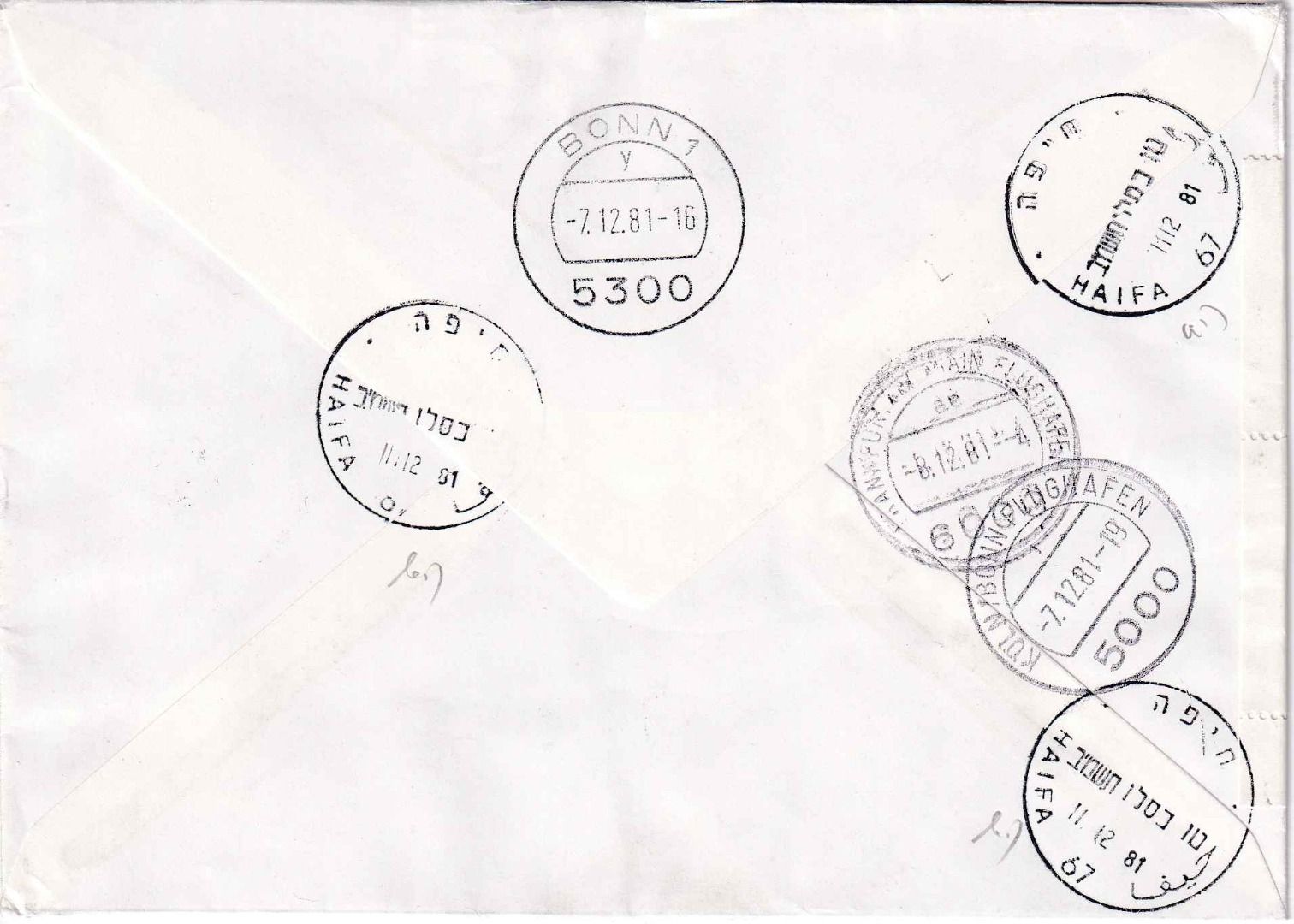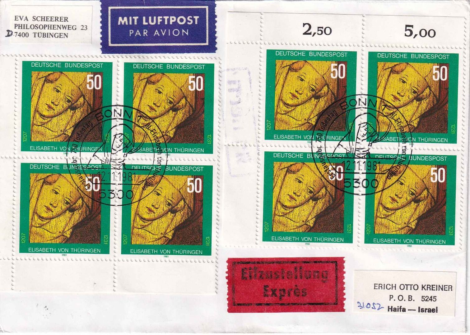 gelaufen n. Haifa - portorichtig: 90 Pfg. Brief bis 20g + 250 Pfg. Eilgebühr + 3x20 Pfg. Lupo je 5g = 400 Pfg. - rs. Durchgangs- und Ank.stempel - ohne Inhalt - Marken in 2 Viererblocken je aus der Bogenecke - Stichwort: Religion