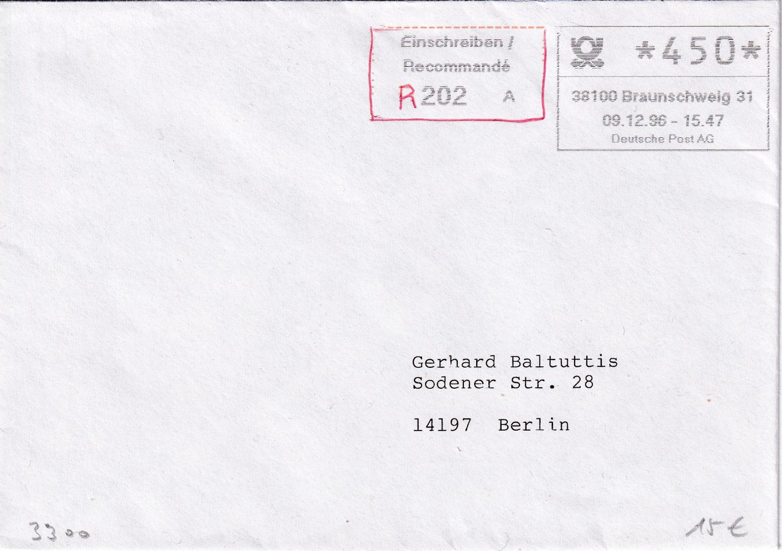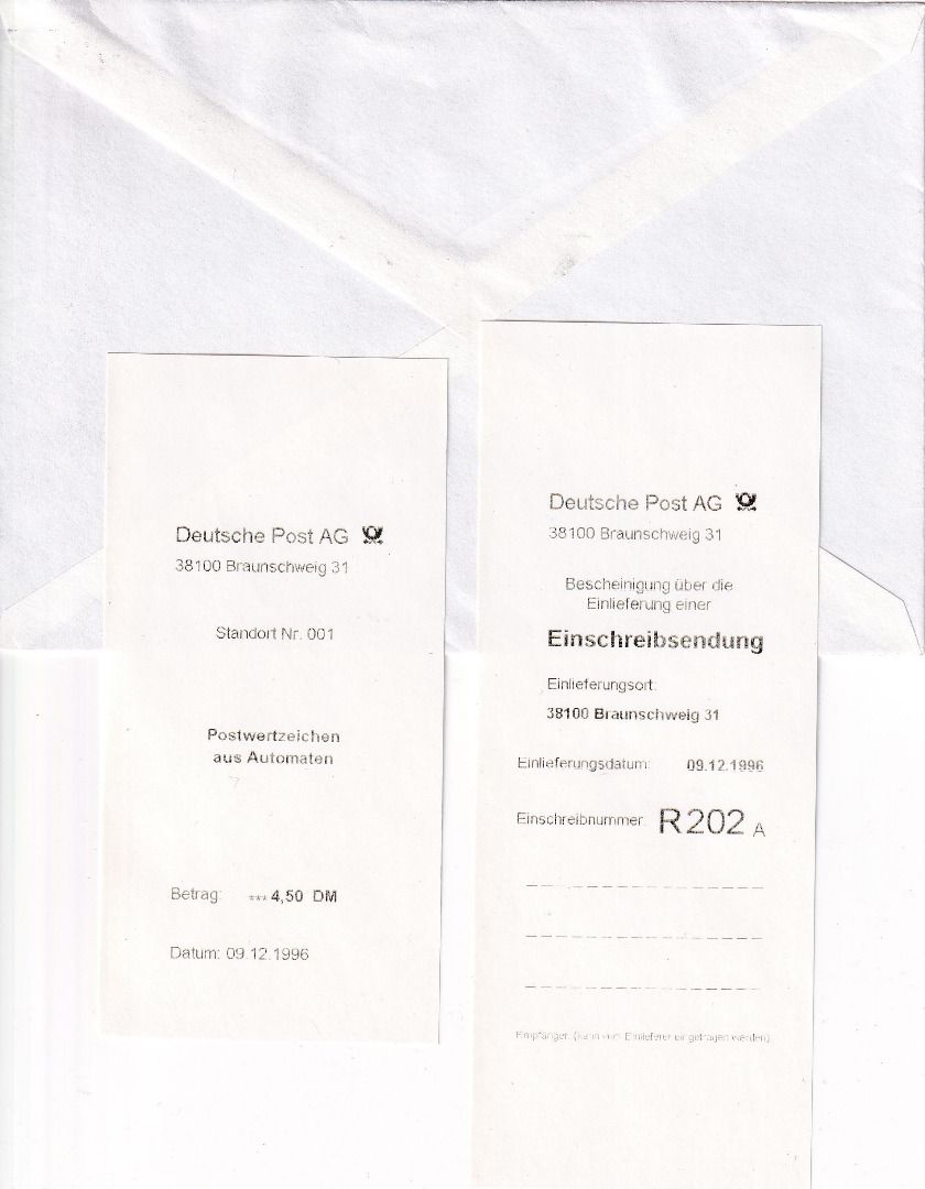 mit Quittung und Aufgabeschein - Versuch der Deutschen Bundespost in den Jahren 1995-1997 für ein automatisches Briefannahmesystem der Firma Nagler Automaten Technik GmbH aus Wernberg- Köblitz - ohne Inhalt