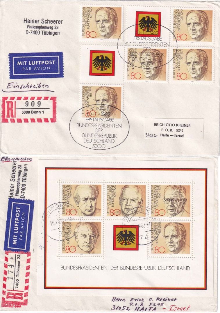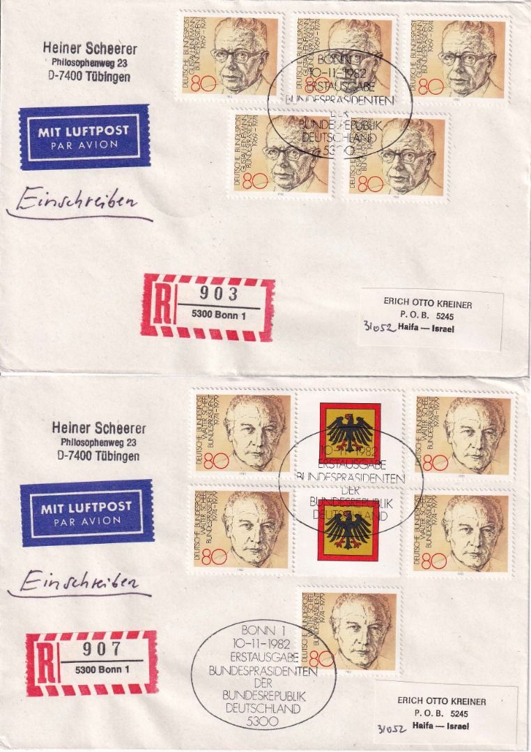 Marken ex Block je 5x als Mehrfachfrankaturen und Block als Einzelfrankatur - alle Briefe als Luftpost-Einschreibbrief portorichtig !! - Tarif: Brief 120 + Einschreiben 200 + Luftpost 4x20 je 5g - alle Briefe mit Ankunftsstempel - sehr selten !!