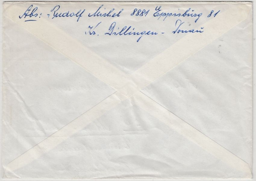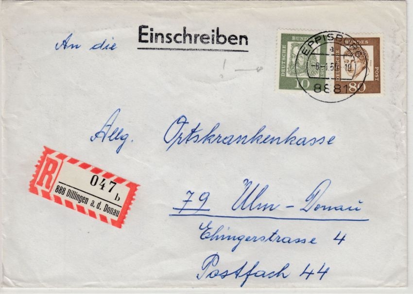 BRD - Eppisdorf Poststelle I/R-Zettel Dillingen, Einschreibebrief n. Ulm 1965