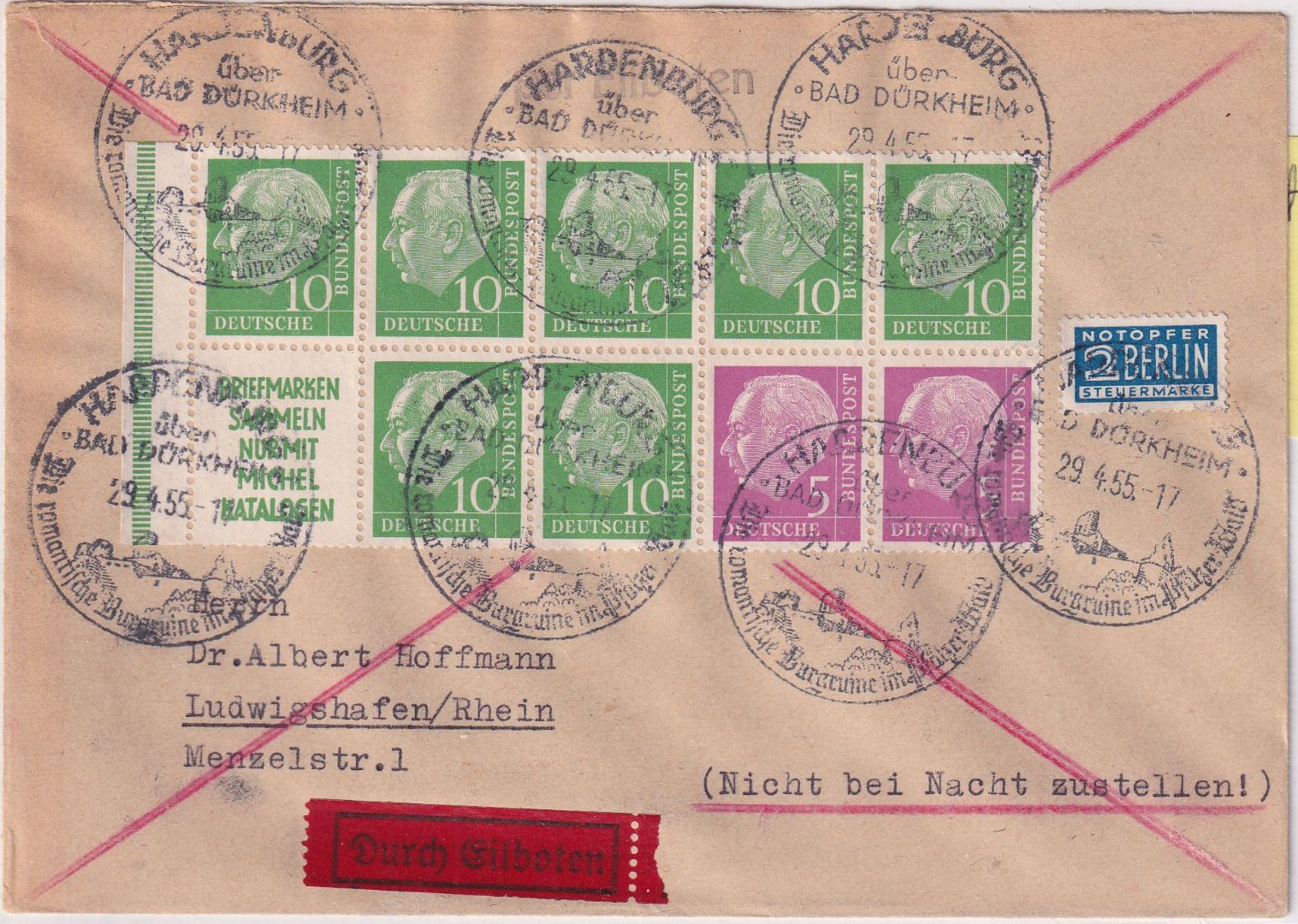 gelaufen nach Ludwigshafen - ohne Inhalt - seltene portorichtige Einzelfrankatur des Heftchenblattes !