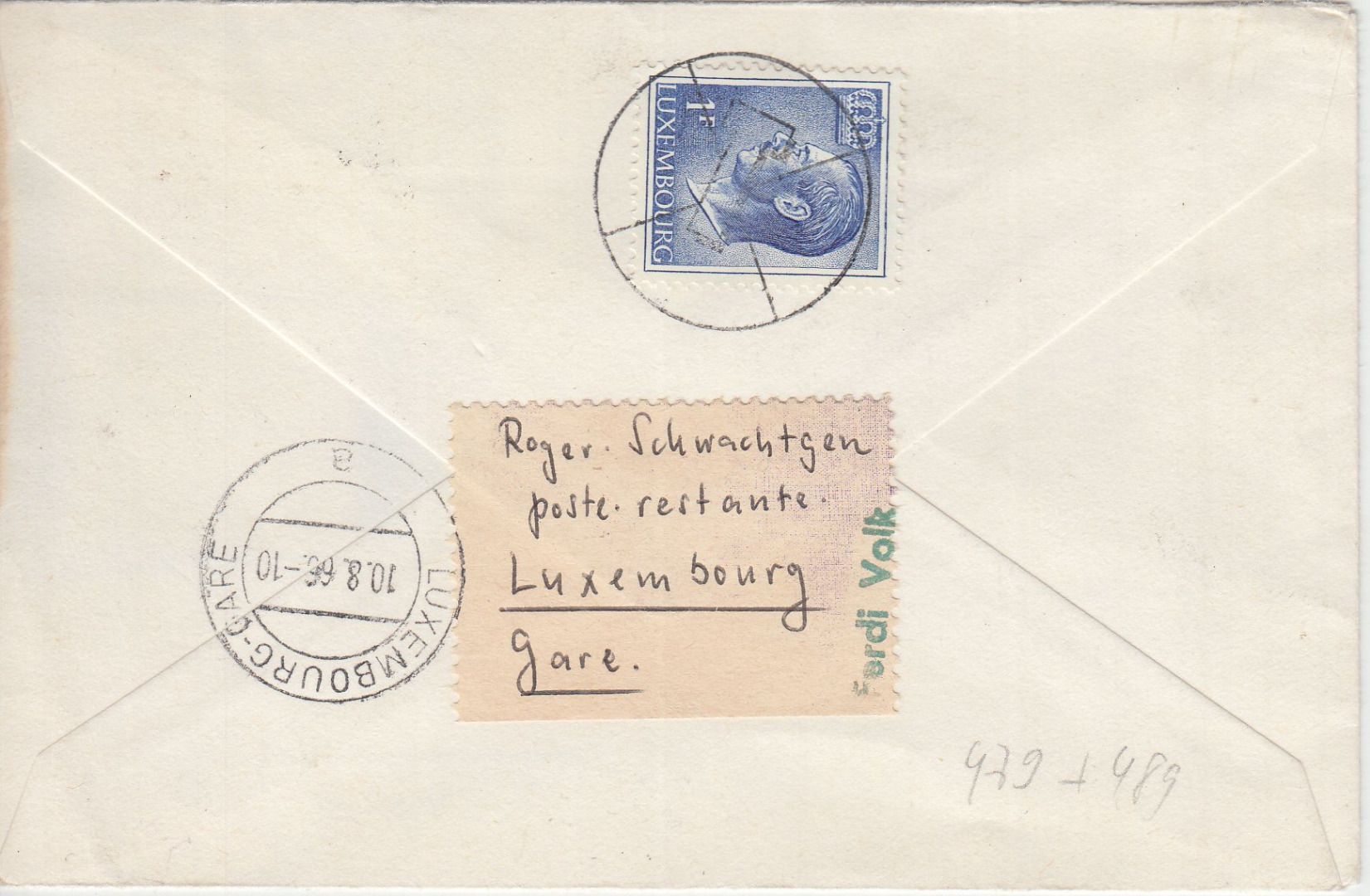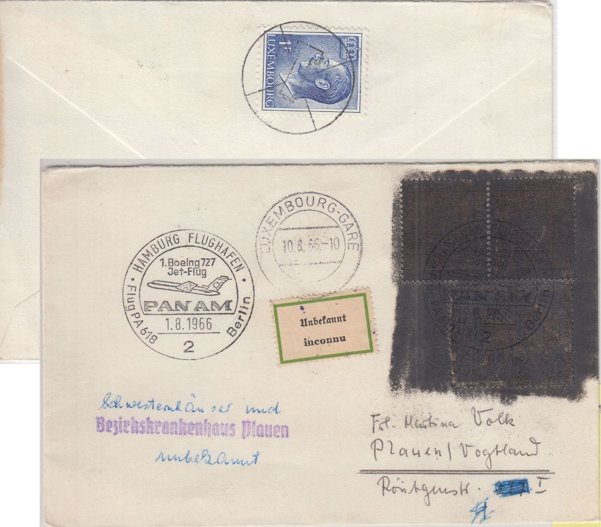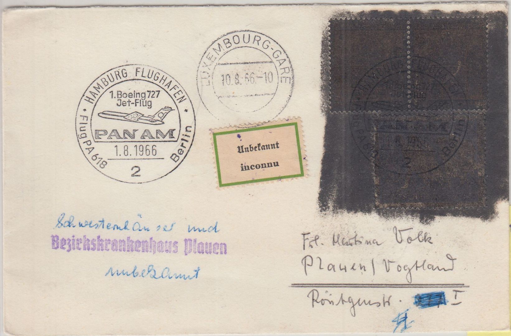 PAN AM Erstflug Hamburg Berlin, Ableitung Plauen - retour n. LUXEMBURG/postlagernd - rs. 1 Fr. lux. Postlagergebühr - Marken mit schwarzer Übermalung - ohne Inhalt
