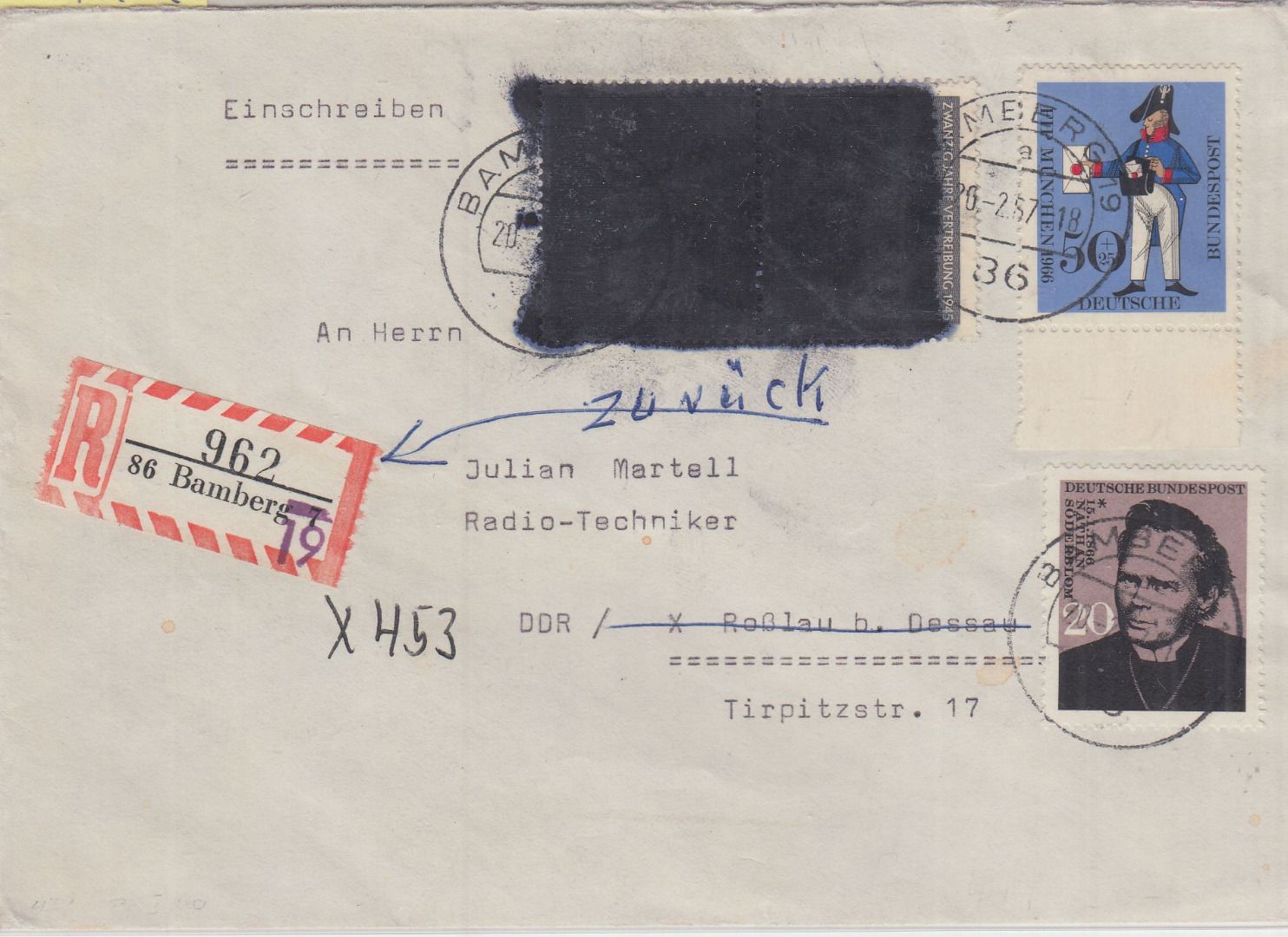 gelaufen v. Bamberg n. Roßlau - geänderter R-Zettel Bamberg 7 auf 19 - mit Einlieferungsschein - Marken mit schwarzer Übermalung - ohne Inhalt