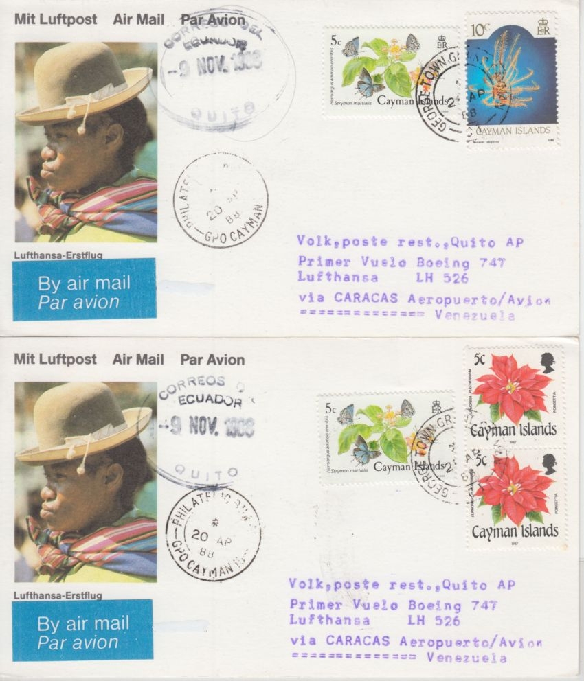 beide Belege zwar mit Ankunftsstempel Quito, aber vermutlich verspätet eingetroffen und daher nicht mehr mit Erstflug befördert