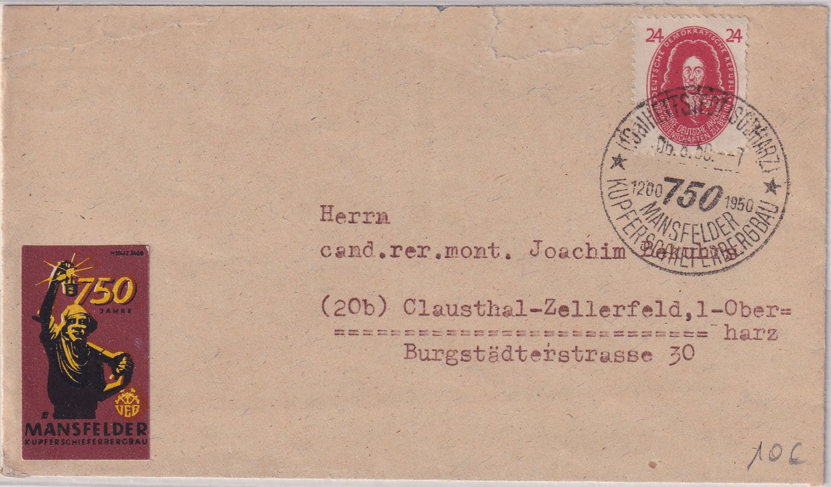 Handwerbestpl. "750 Jahre Mansfelder Kupferschieferbergbau" und entspr. Werbevignette - Kuvert oben kl. Öffnungsmgl. sauber korrigiert - ohne Inhalt
