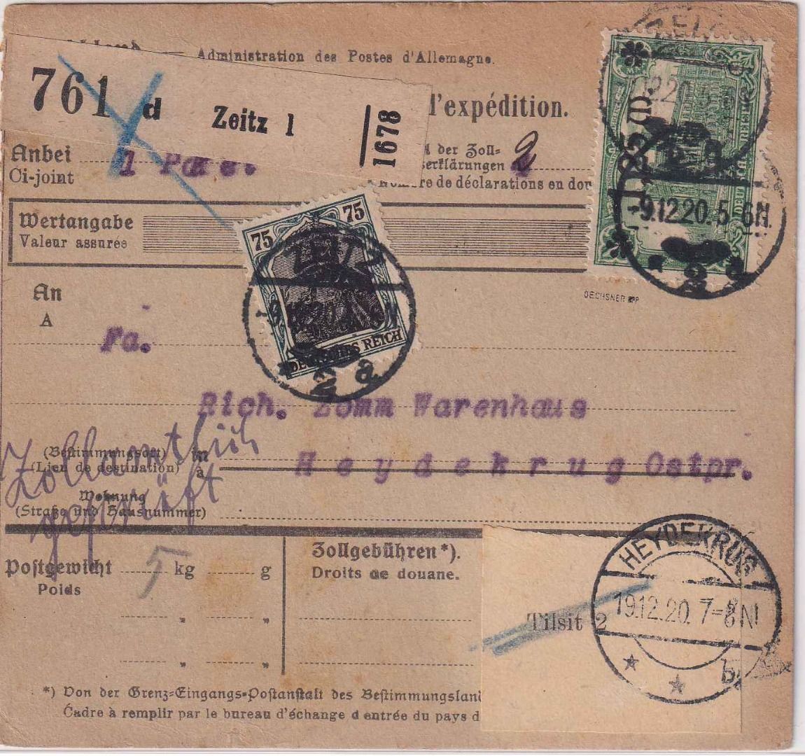 DR - 1,50/1,25 M. Reichspostamt u.a. Paketkarte Zeitz - Heydekrug 9.12.20