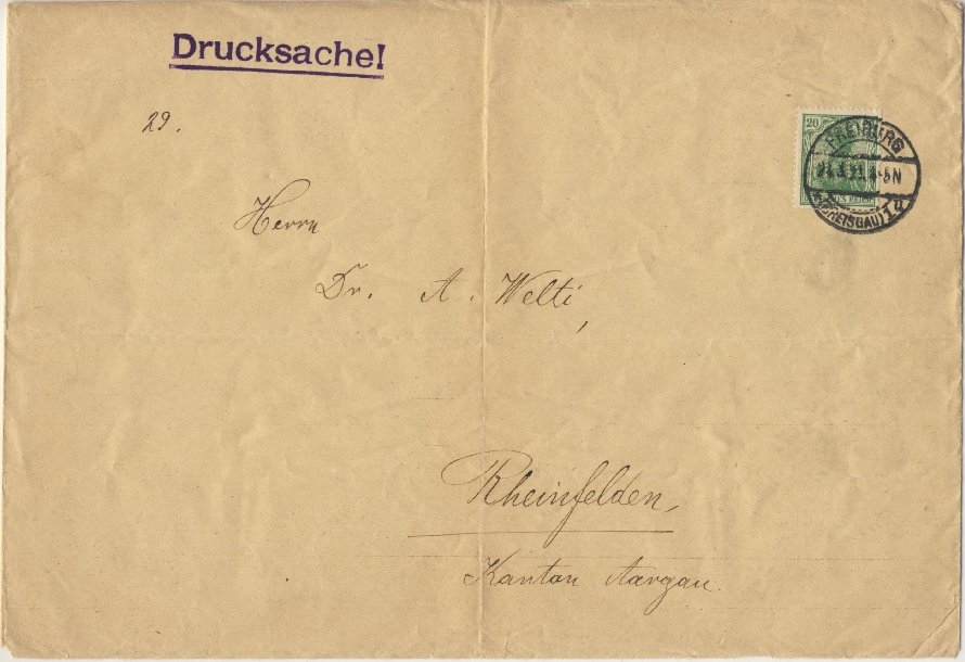 DR - 20 Pfg. Germania/Perfin "HR", Drucksachenbrief i.d. SCHWEIZ, Freiburg -