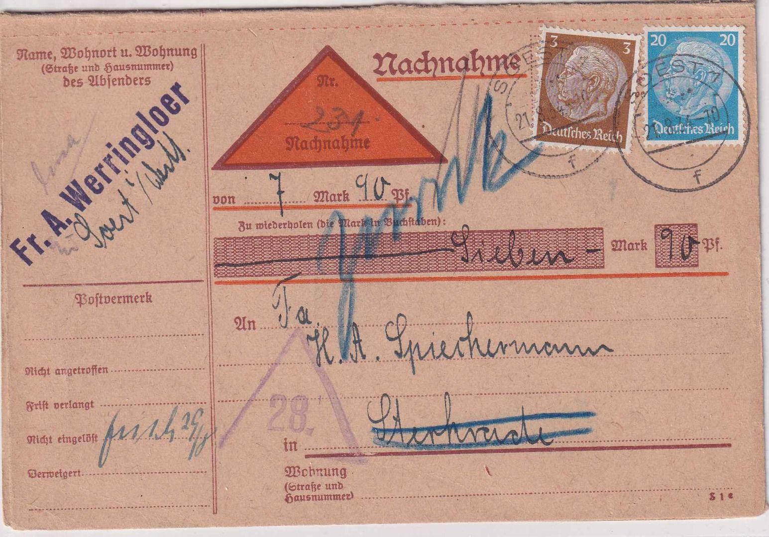 DR - 20+3 Pfg. Hindenburg Nachnahmedrucksachenkarte Soest 1934 Retour