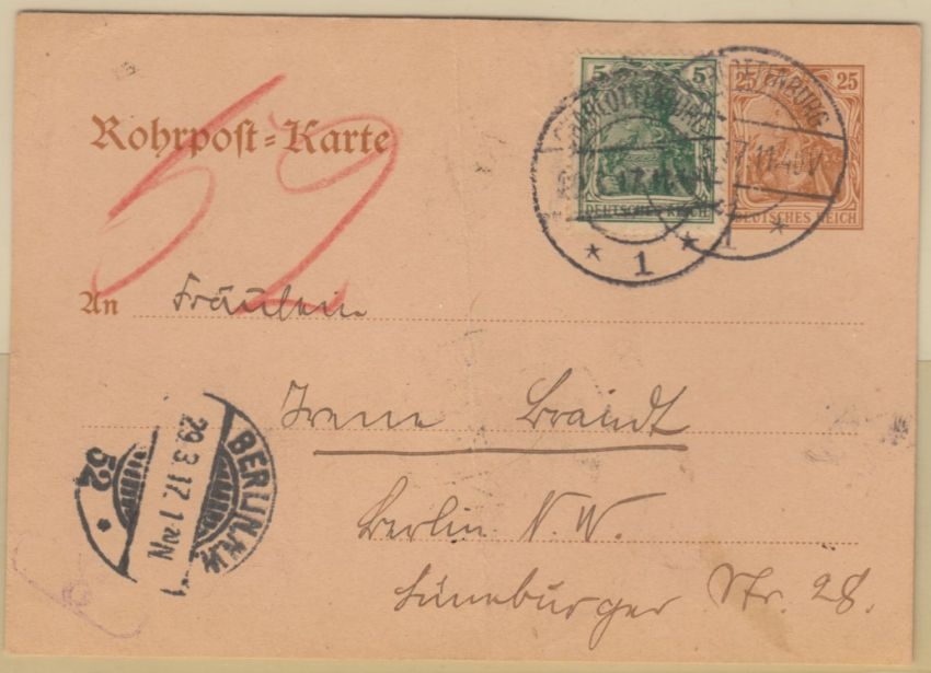 DR - 25 Pfg. Germania Rohrpost Ganzsache + Zusatz Ortskarte Charlottenburg 1917