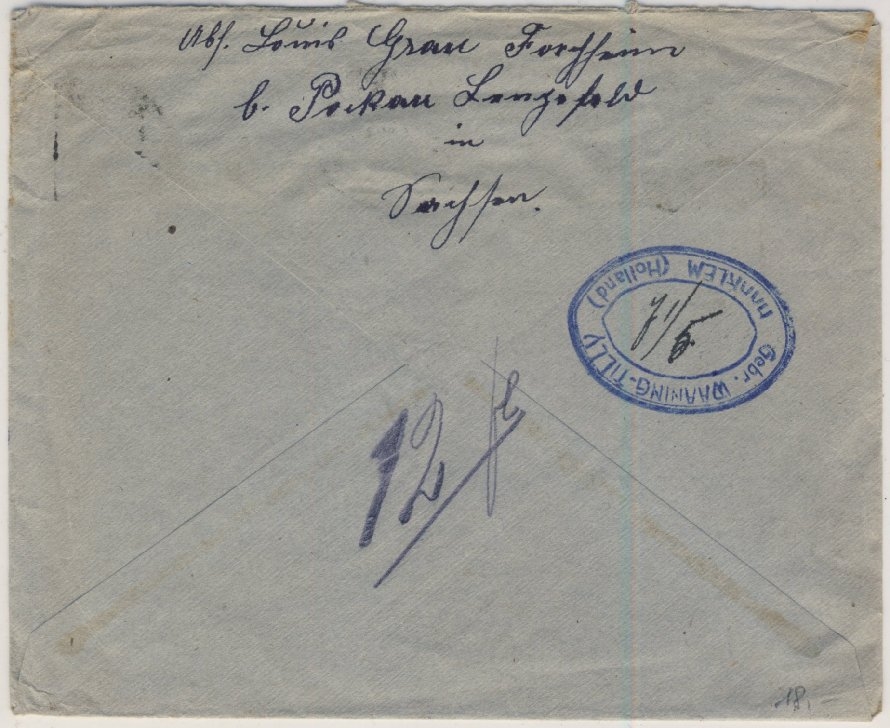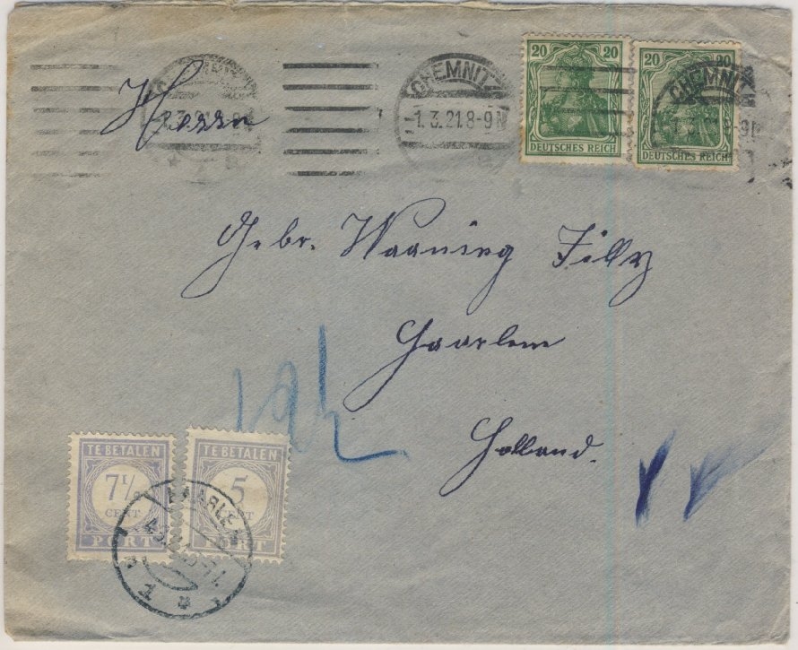 5 und 7 1/2 Ct. niederl. Portomarken - 1x20 Pfg. Germania Zahnfehler - Kuvert ohne Inhalt