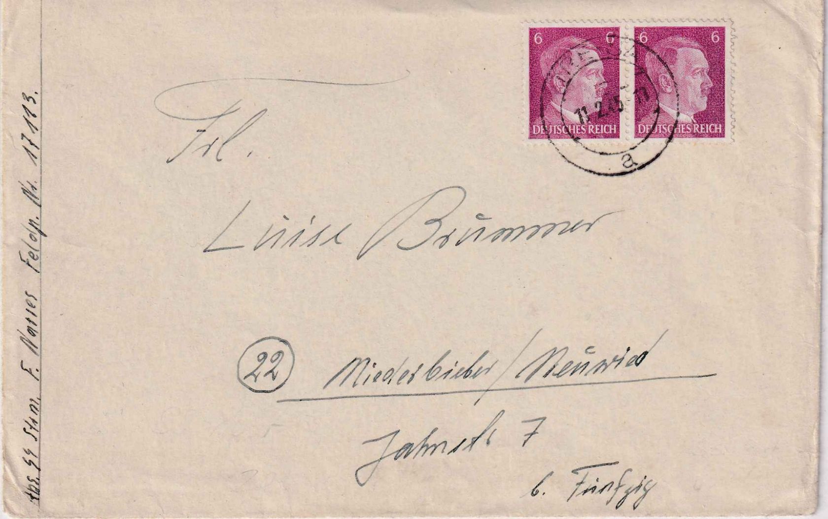 gelaufen n. Niederbieber b. Neuwied - ohne Inhalt - Fp.Nr. 17113 = 1. San.Kp. u. Tr. Entgift. Zug 20, 20. SS-Waffen-Grenadier-Division (estnische Nr. 1)