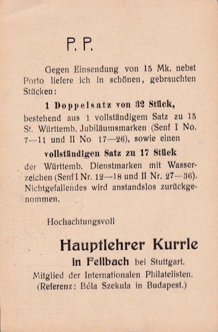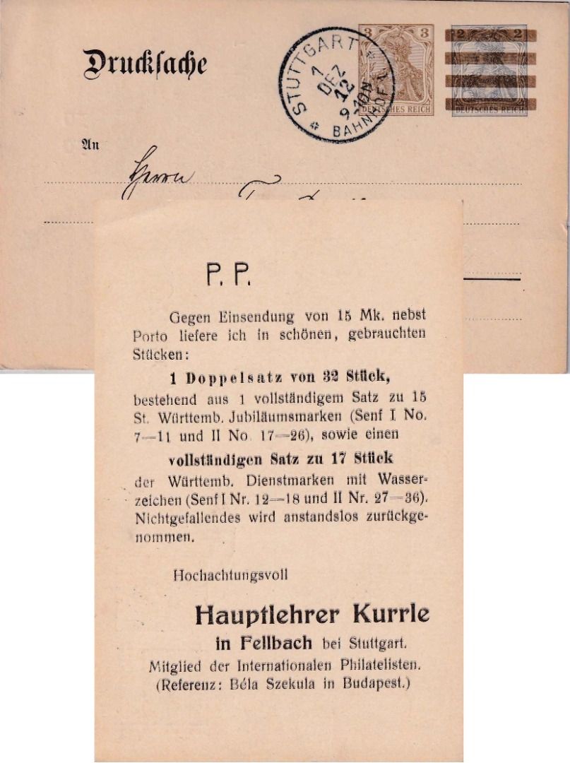 rs. Zudruck d. Hauptlehrer Kurrle Fellbach b. Stuttgart Briefmarkenangebot