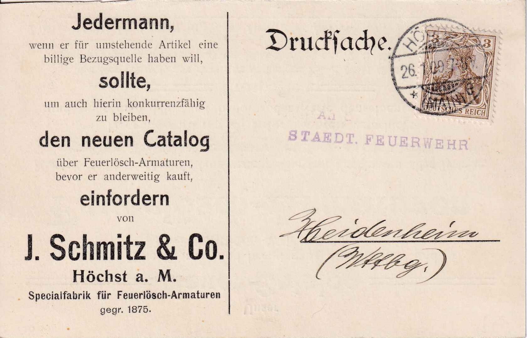 DR - 3 Pfg. Germania Drucksachenkarte (Feuerwehr-Zubehör) Höchst a/M. 1909