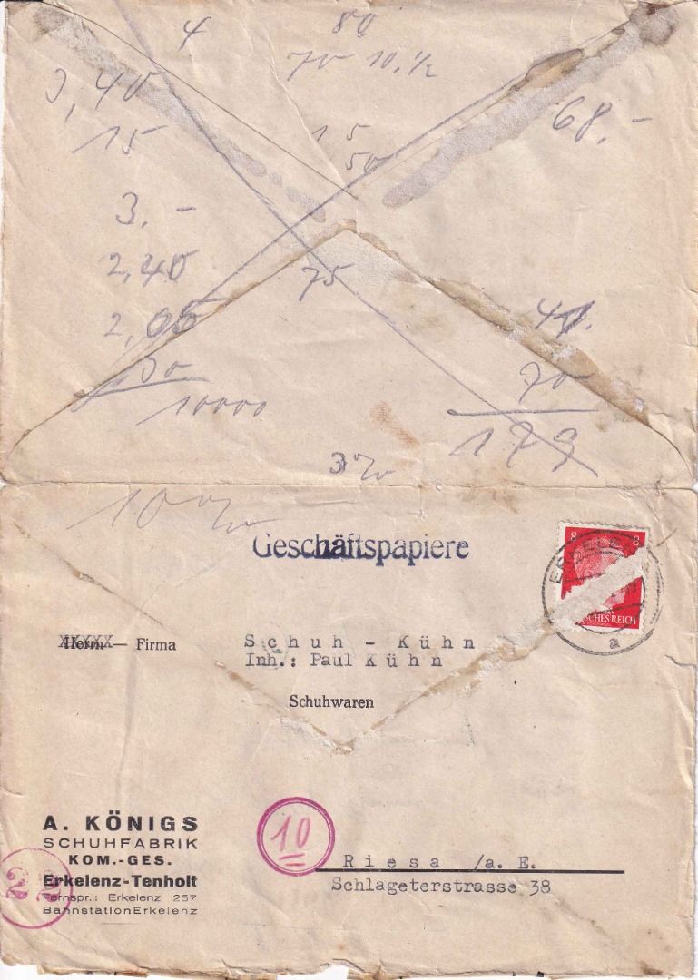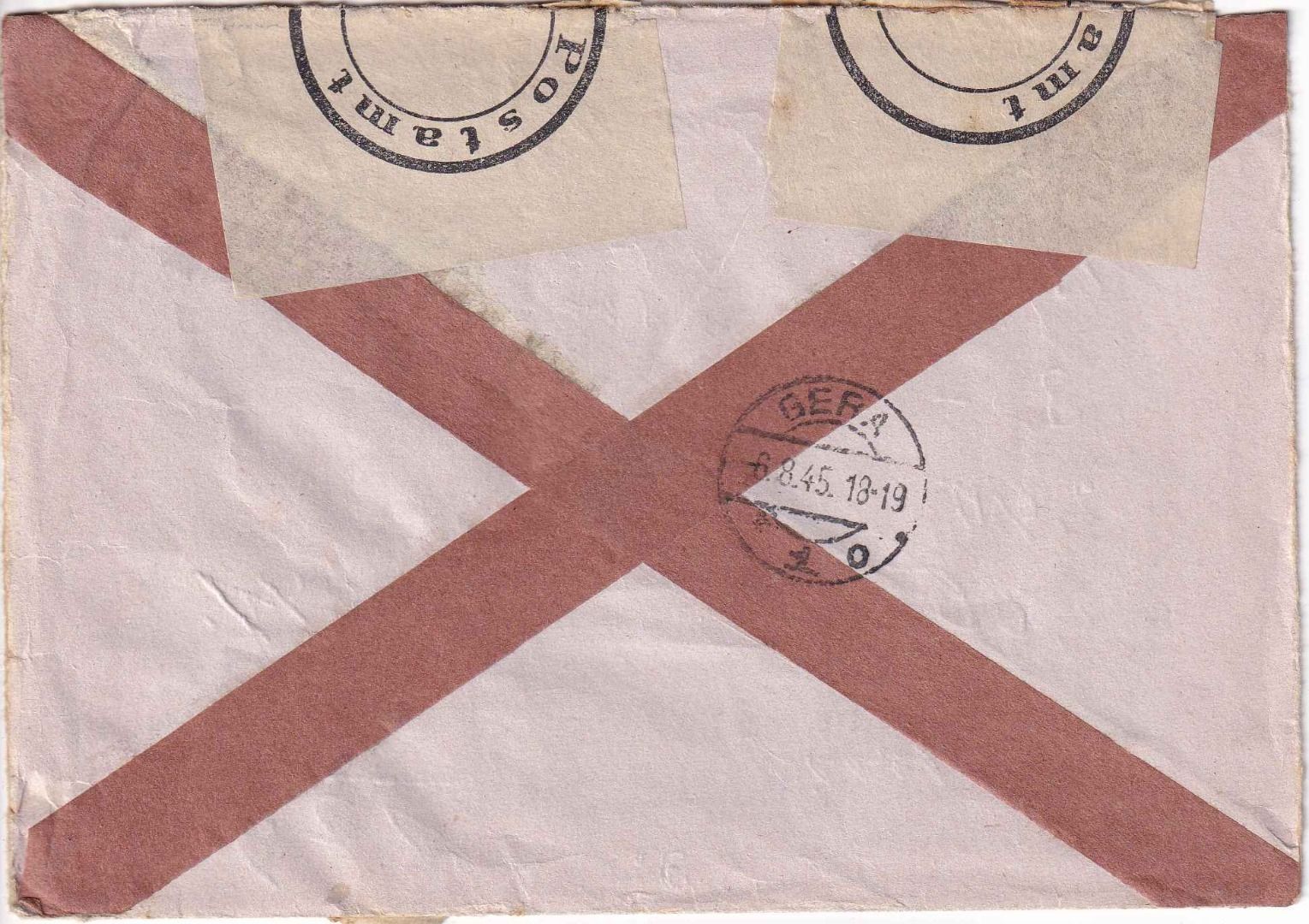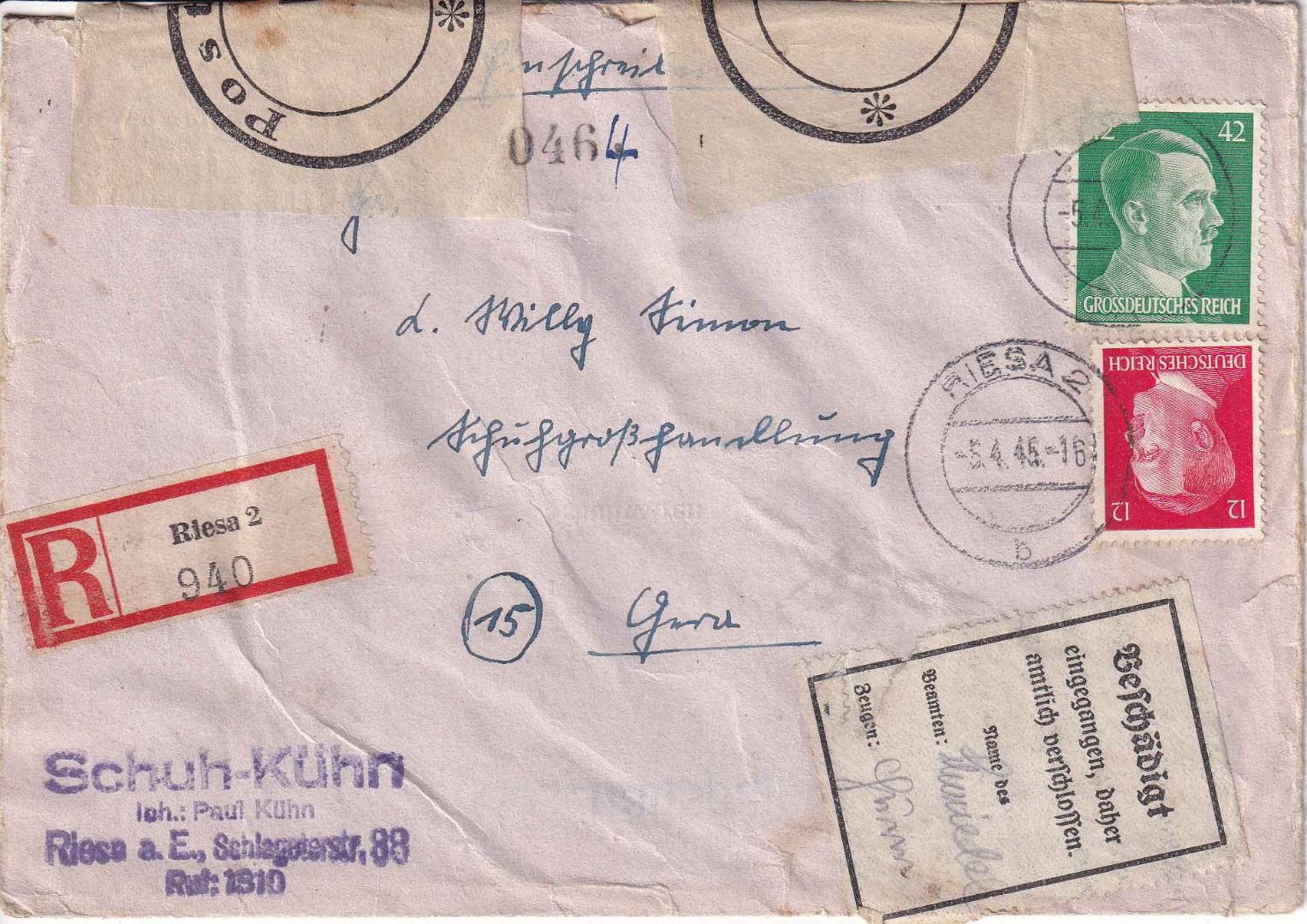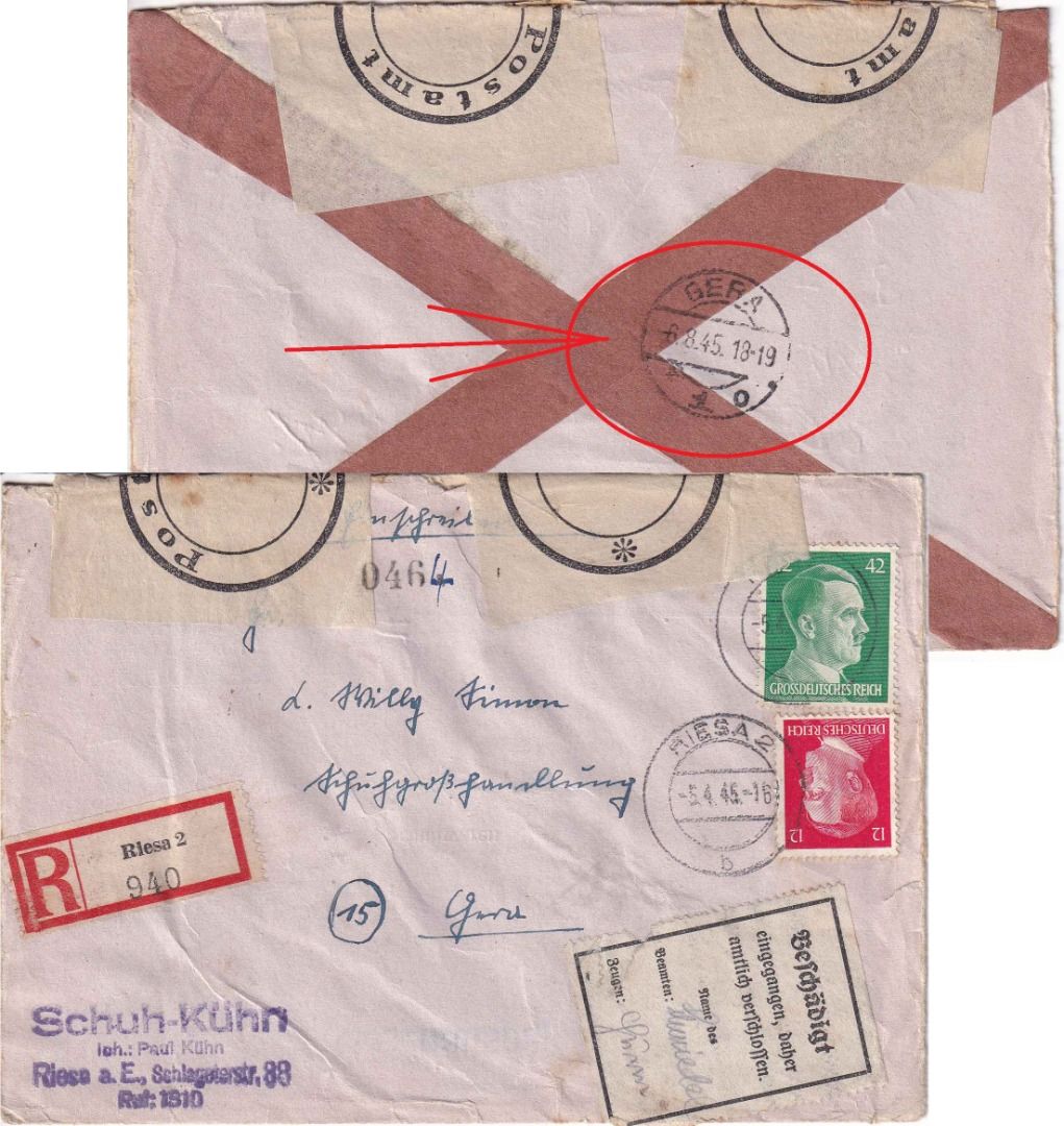 Hinweiszettel "Beschädigt eingegangen..." + Verschlusszettel - Wende-(Not-)Kuvert (dreiseitig offen) - Stichwort: Endphase (Gera wurde am 14.4.45 und Riesa am 24./25.4.1945 von sowjetischen Truppen besetzt) - der Brief wurde ungeschwärzt (!) am 6.8.45 (Ank.stpl.) dem Empfänger zugestellt - zur Frankatur: Sind bedarfsmäßige (!) 42 Pfg. AH-Frankaturen schon keine Massenware, so sind Mischfrankaturen mit anderen AH-Werten bei höheren Portostufen ausgesprochen selten, in der Kombination als Überroller eine "Sahnetorte" !