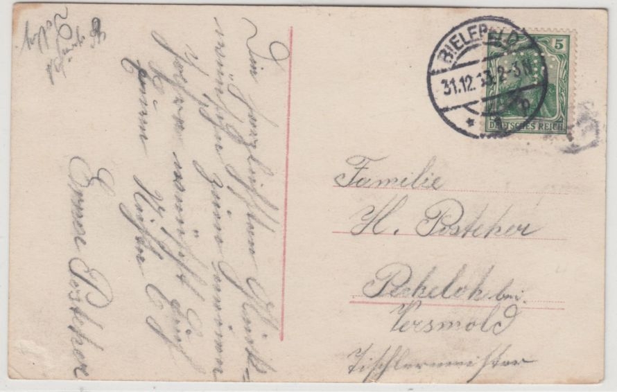 DR - 5 Pfg. Germania/Perfin "FP", Karte Bielefeld - Versmold 1913
